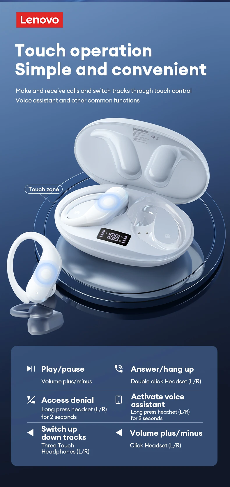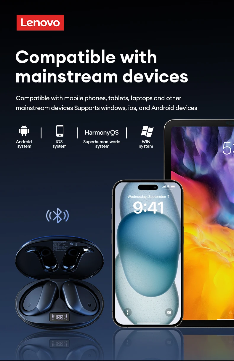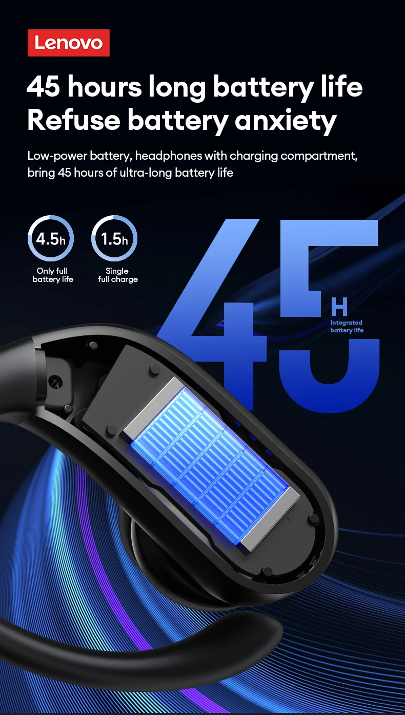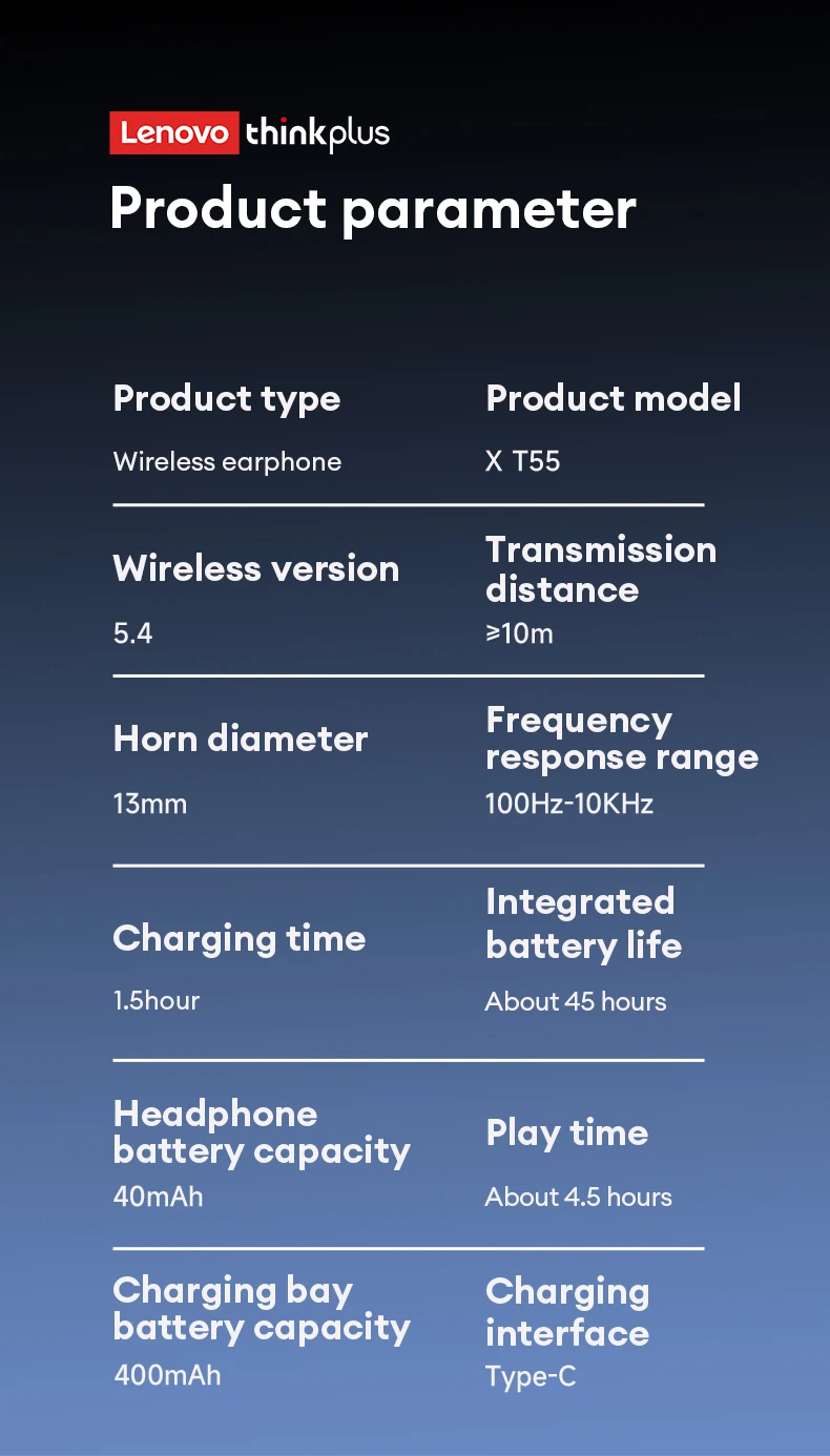 Característica:1.[Diseño ergonómico/Ajuste cómodo]:2.[Controlador grande de 13 mm/audio envolvente]:3.[Llamadas HD con micrófono dual/transmisión precisa]:4.[Duración de la batería de 45 horas/pantalla de alimentación LED]:5.[Chip Bluetooth 5.4/conexión estable]:6.[Controles táctiles/compatibilidad universal]:Especificación[Modelo]: Lenovo XT55