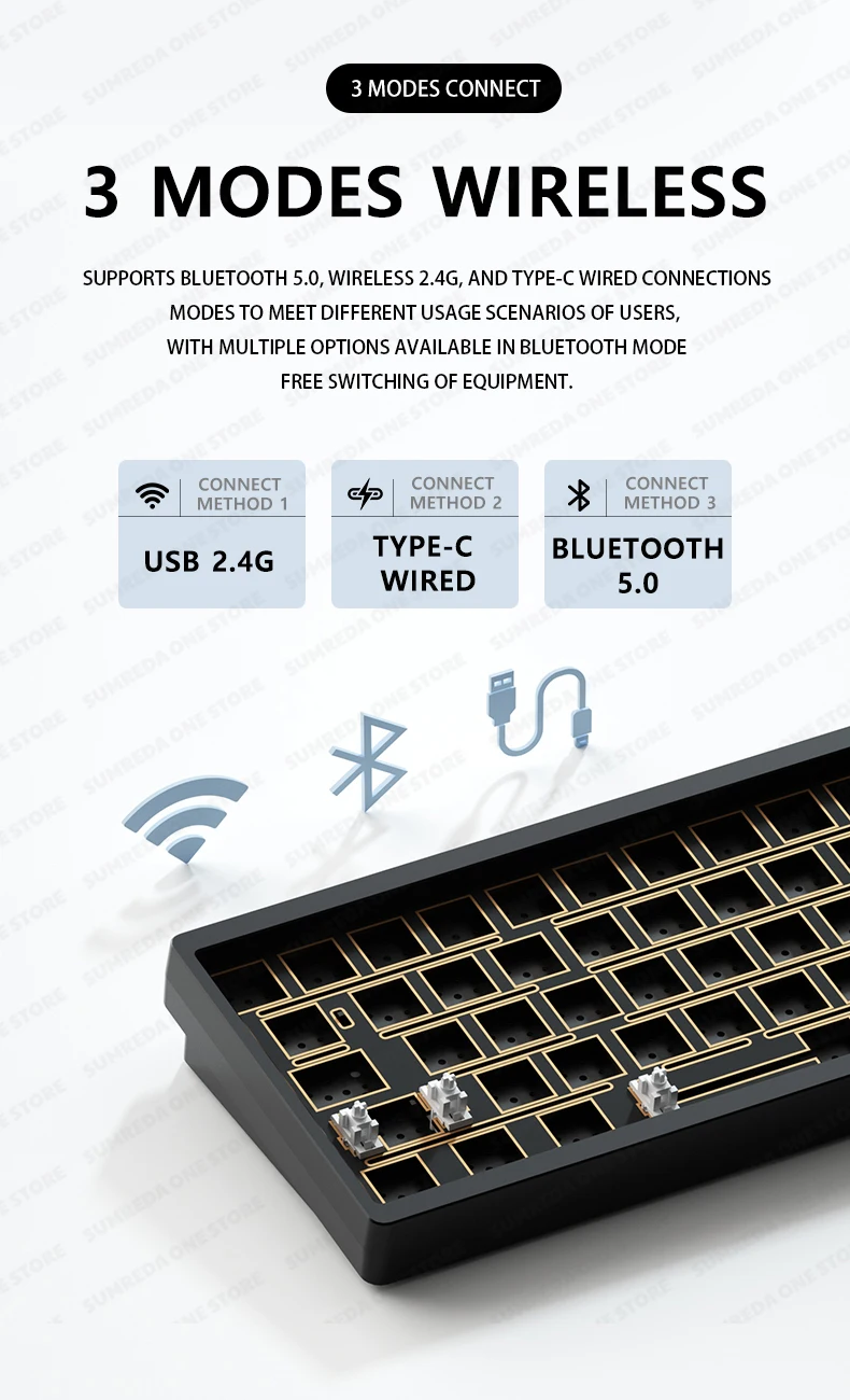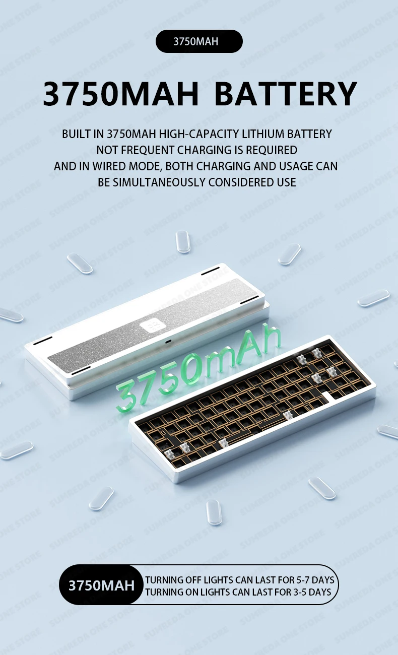 Admite conexión Bluetooth, 2.4G y TYPE-C.Caja de aluminio, ánodo/electroforesis de 220 mallas, batería de 6000 mAh y placa de posicionamiento FR4, luces ARGB, interruptor de luz sur, peso 1150 g.