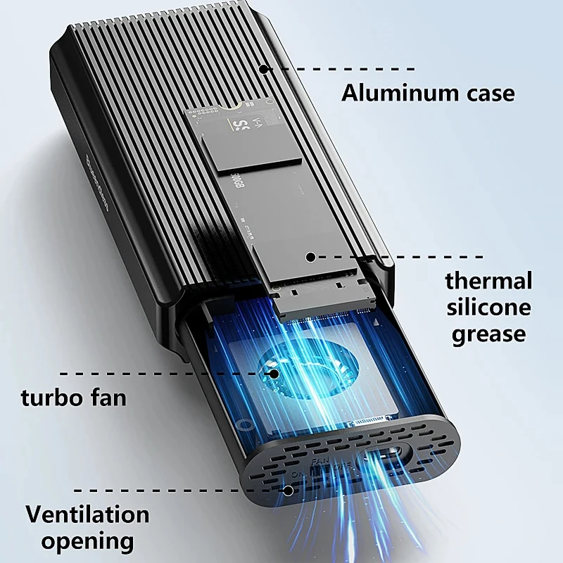 Ventilador de refrigeración incorporado: rápida disipación del calor a través de rejillas de ventilación en ambos extremos de la carcasa SSD, evitando una alta generación de calor y afectando las velocidades de transmisión.Nota: No es necesario instalar grasa térmica en su SSD para evitar afectar la ventilación del conducto de aire.