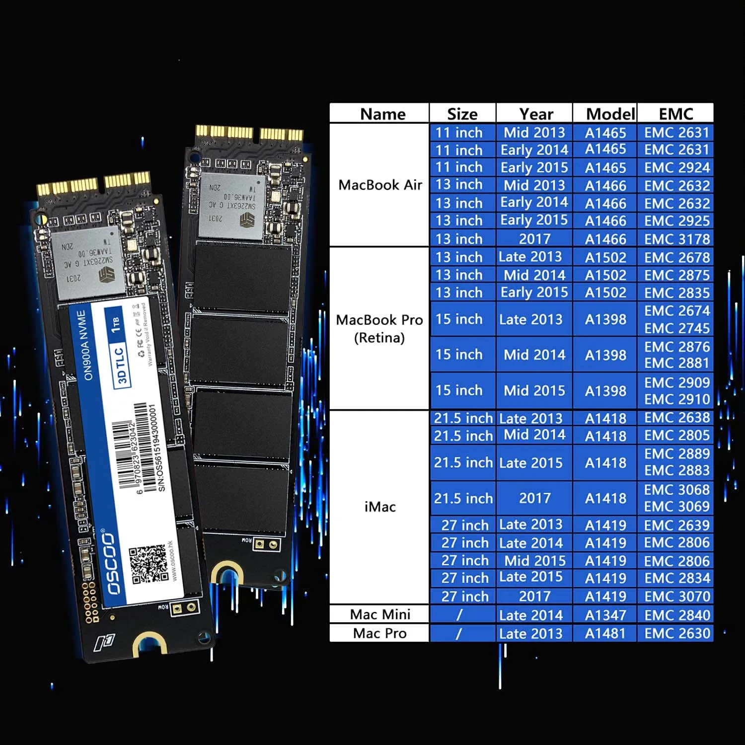 OSCOO NVMe SSD de 512 GB, unidad de estado sólido interna PCIe Gen3x4 con NAND 3D para MacBook Air (mediados 2013-2017), MacBook Pro (Retina, finales de 2013 y mediados de 2015), Mac Pro (2013) y Mini (2014), iMac (2013-2017)
