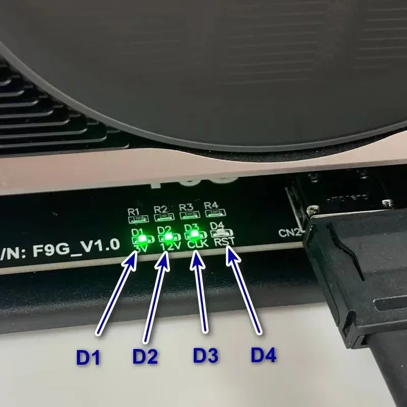 El dispositivo es solo una luz en la que D1 representa la detección de cables; D2 representa el estado de la fuente de alimentación de la base de gráficos; la luz está encendida para marcar el inicio de la base de gráficos; d3 no se ilumina cuando algunas tarjetas gráficas AMD están en uso; Y D4 parpadea cuando se enciende y apaga.