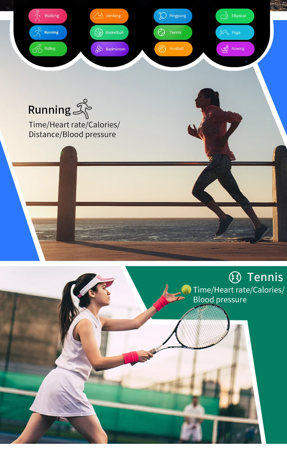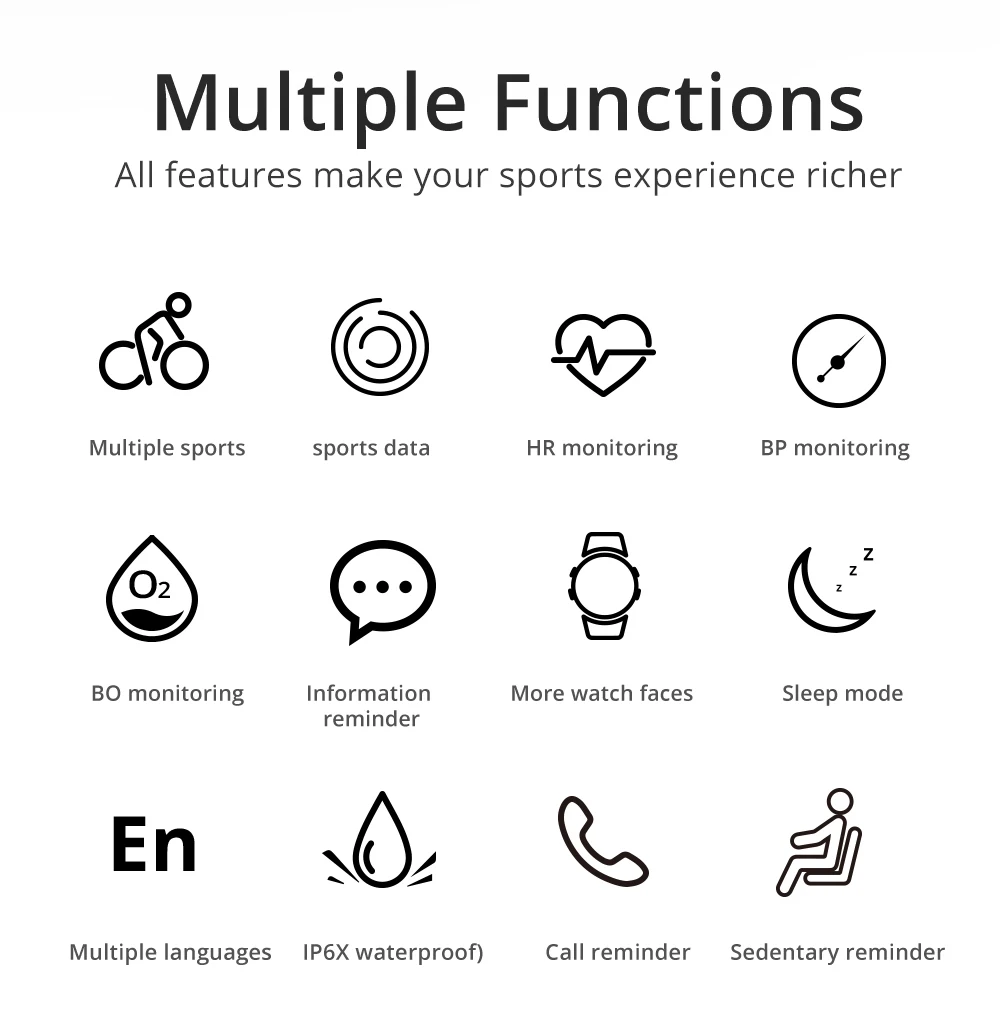 Podómetro, sueño, clima, ritmo cardíaco, presión arterial, recordatorio de llamada, Modo deportivo múltiple, cronómetro, control de música, recordatorio sedentario, recordatorio de agua, reloj despertador, empuje de información