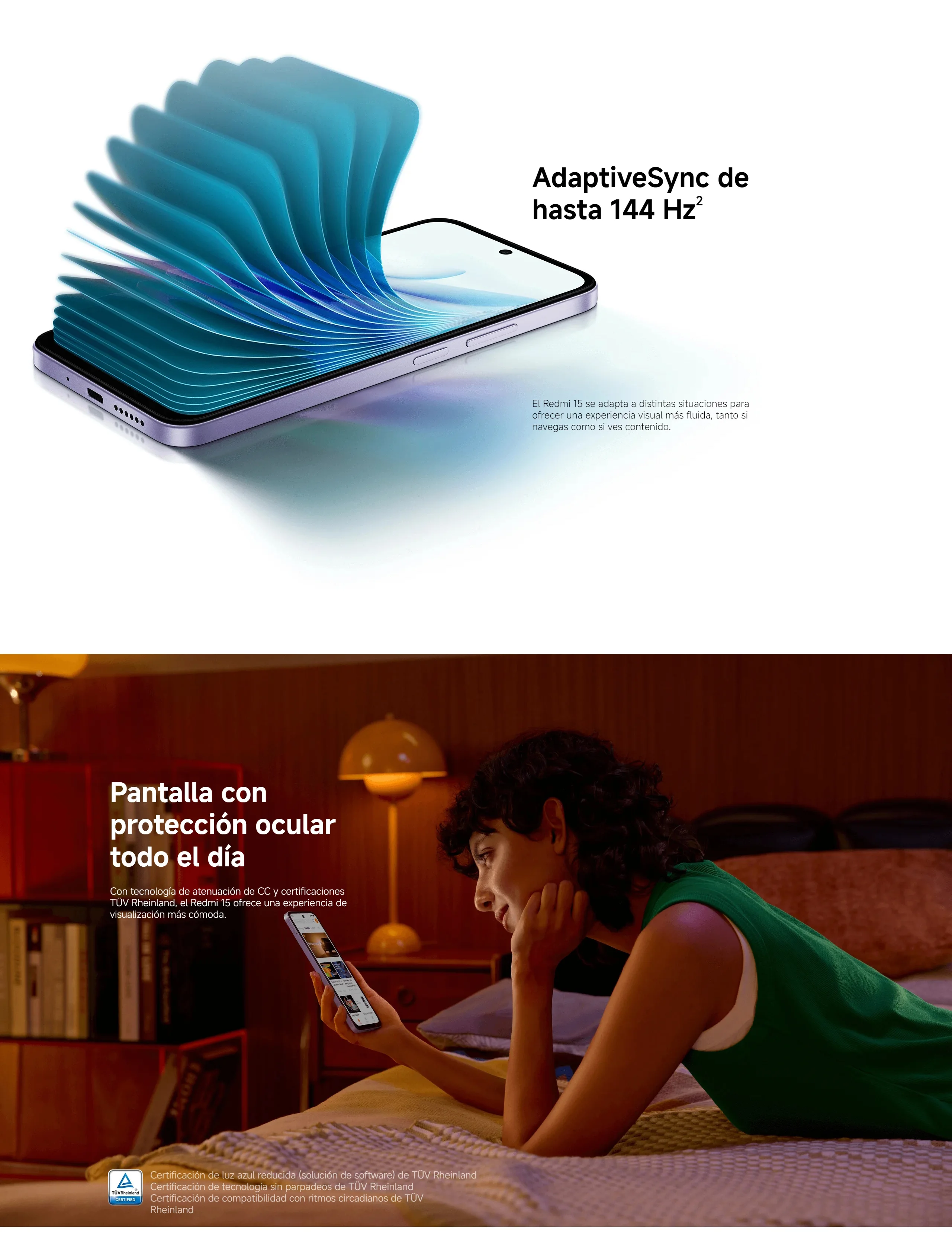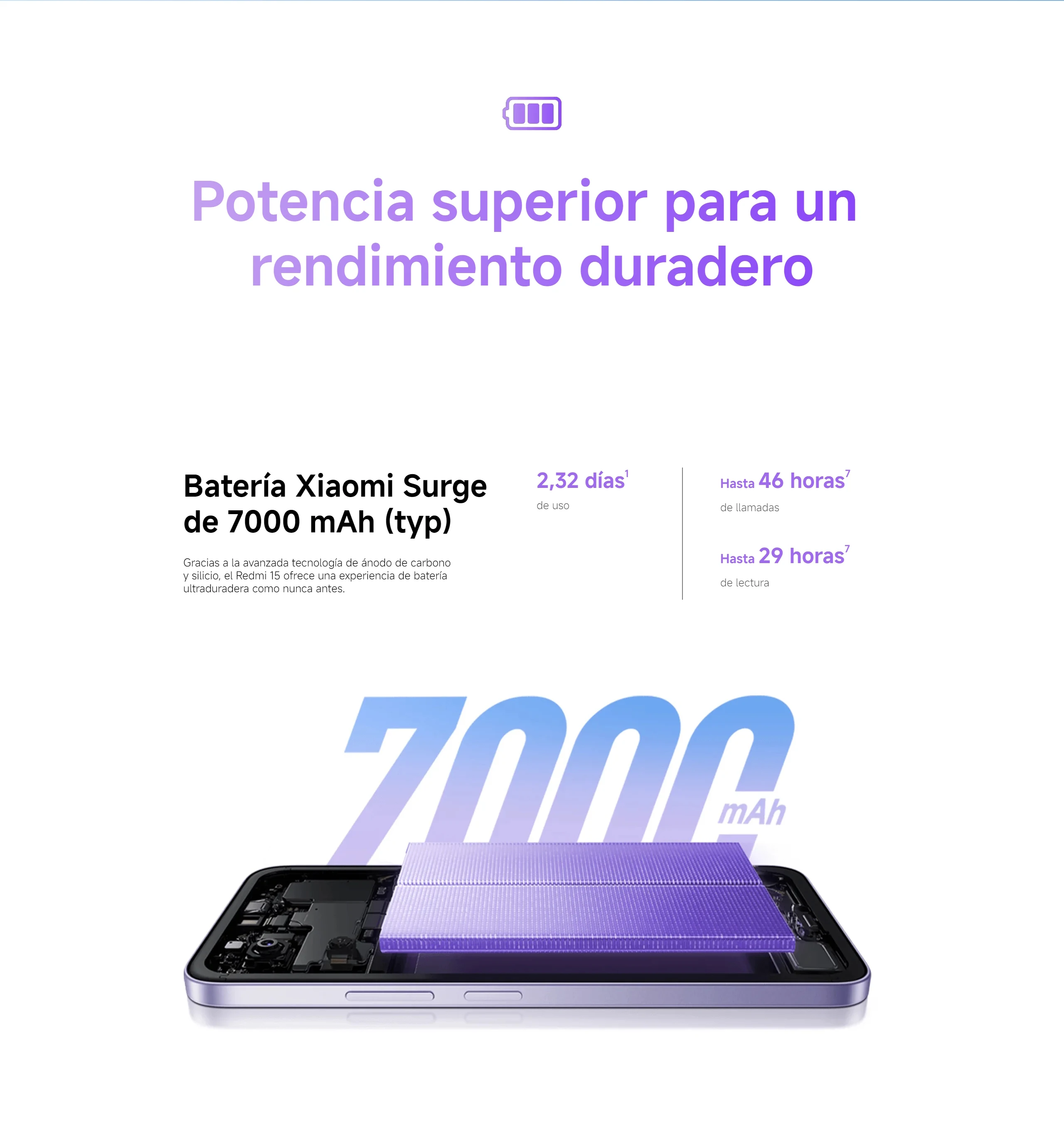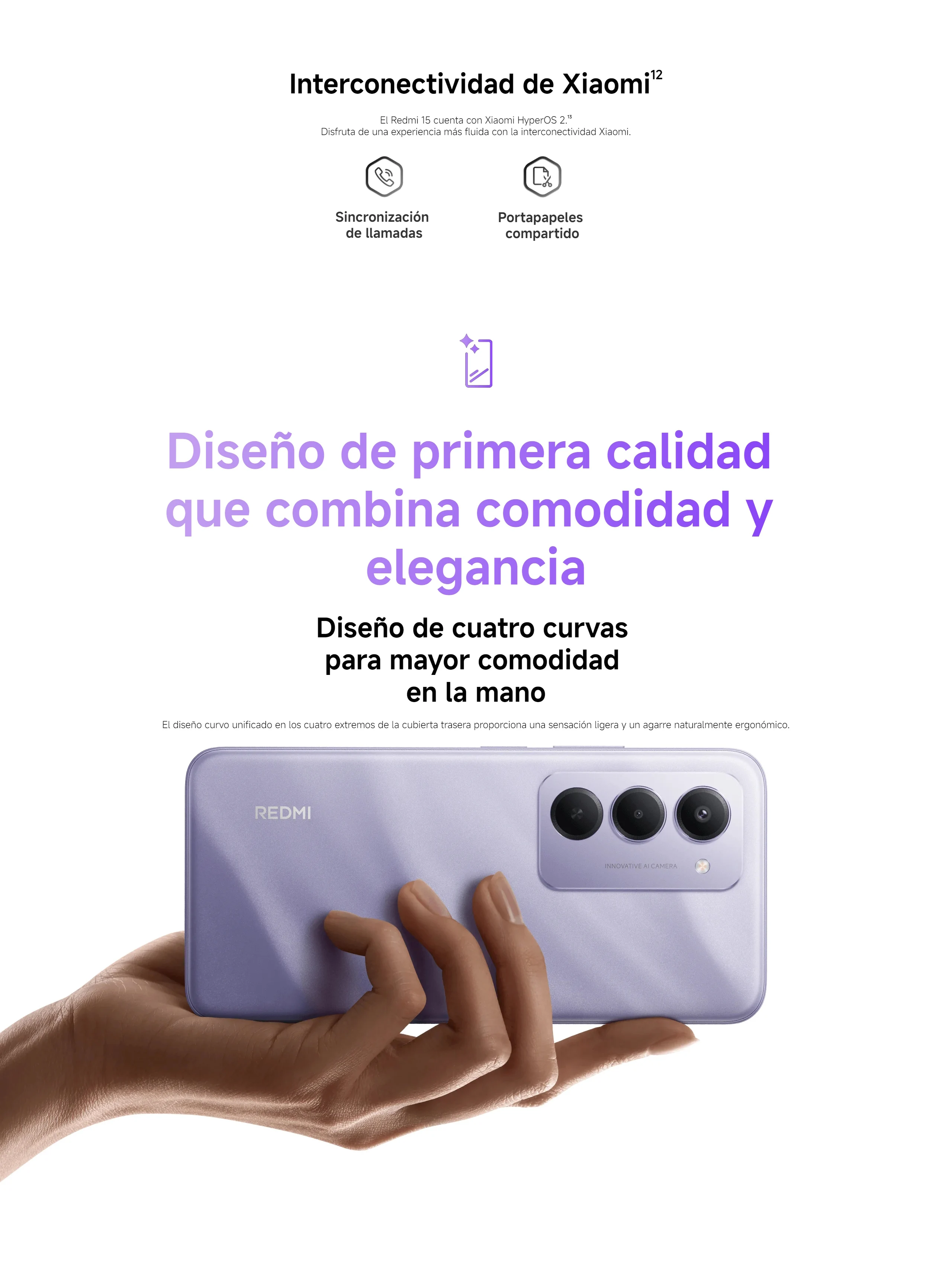 Official | REDMI 15 Batería masiva de 7000 mAh (típ.) Pantalla FHD+ inmersiva de 6,9" Potente Snapdragon® 685 Diseño de cuatro curvas para mayor comodidad al sujetarlo Carga rápida de 33 W5 Sistema de cámara dual de 50 MP con AI