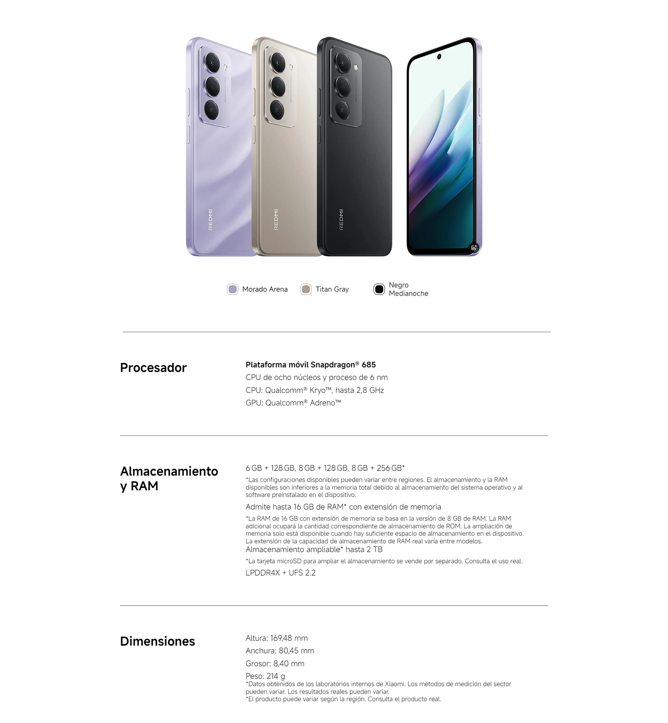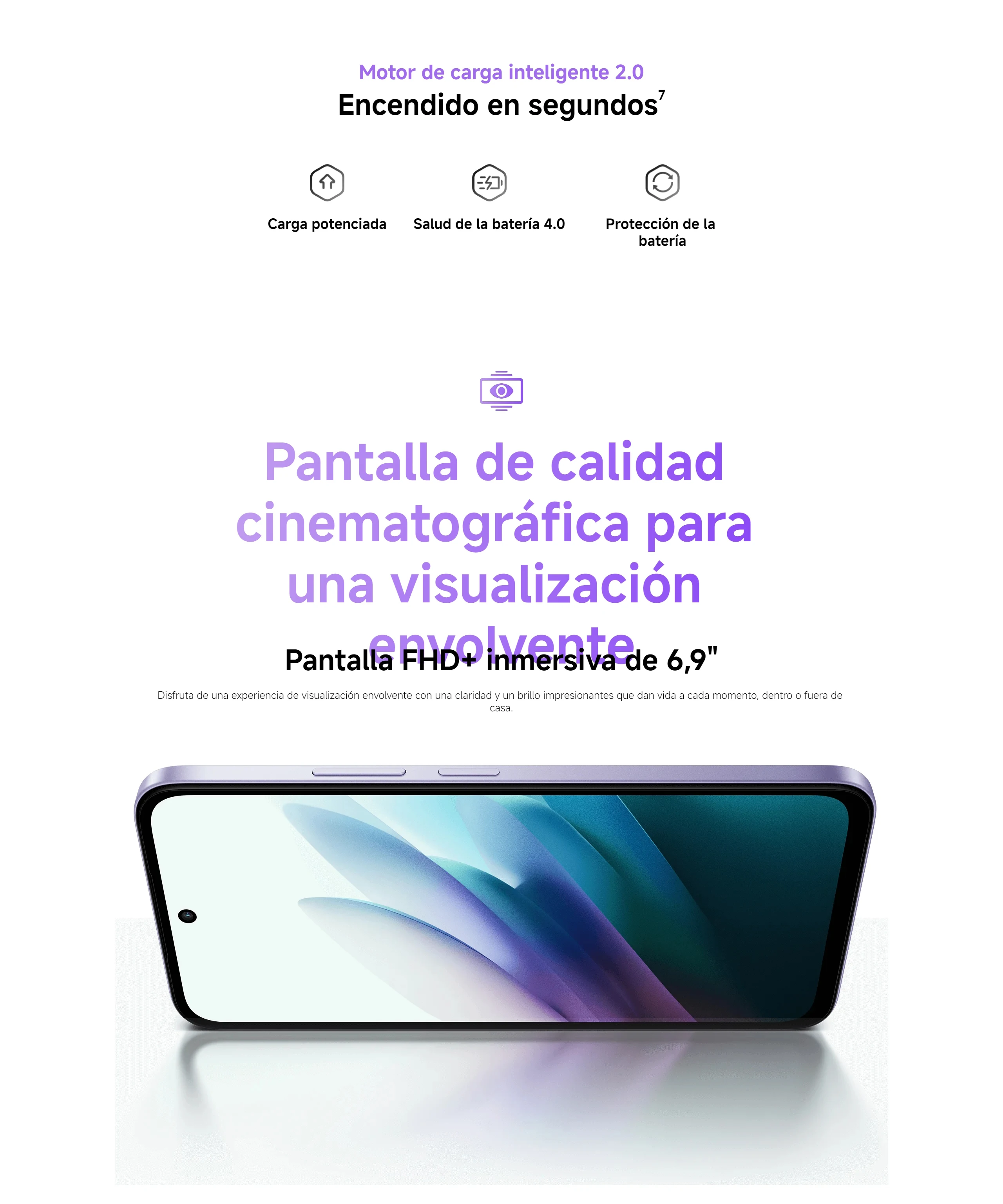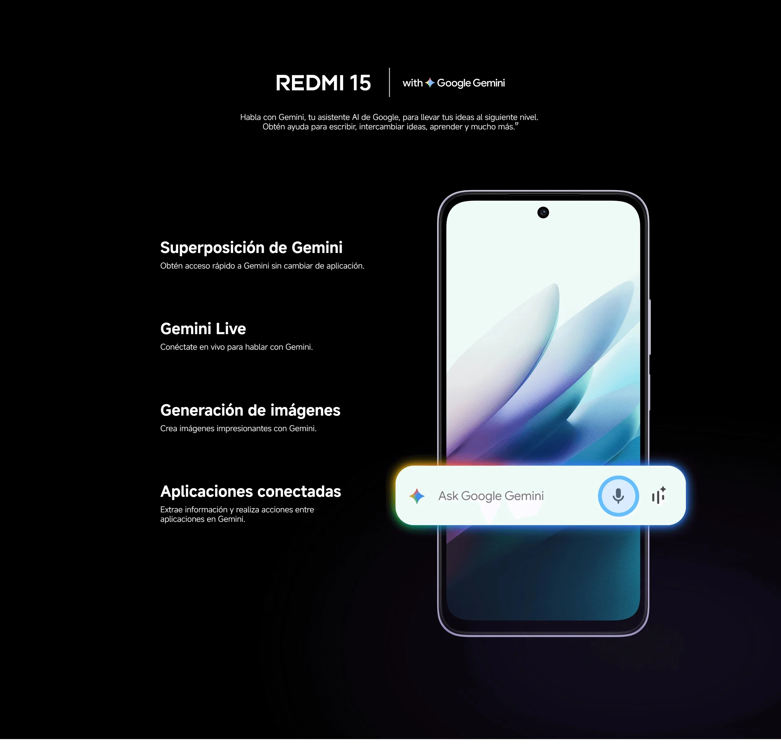 Official | REDMI 15 Batería masiva de 7000 mAh (típ.) Pantalla FHD+ inmersiva de 6,9" Potente Snapdragon® 685 Diseño de cuatro curvas para mayor comodidad al sujetarlo Carga rápida de 33 W5 Sistema de cámara dual de 50 MP con AI