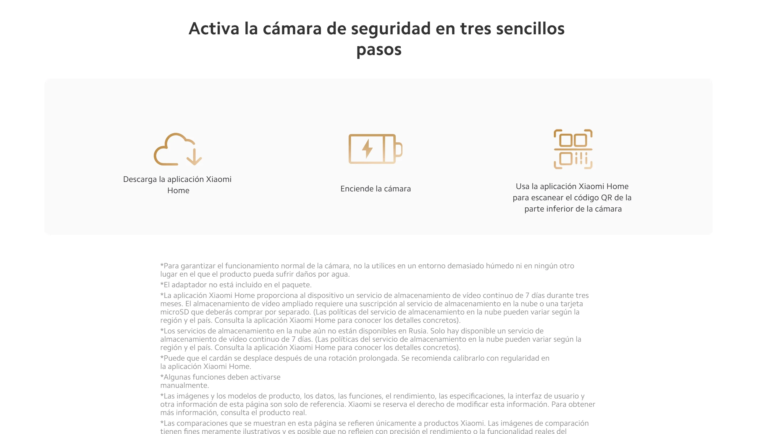 Todo bien, fácil de conectar a la aplicación Xiaomi Home, lo único que no me ha gustado es que no incluye el alimentador de corriente. Aunque está indicado que no lo incluye, me parece lamentable que esta marca no lo incluya. MAL. De buscar otra cámara me aseguraría de que sí lo incluye.
