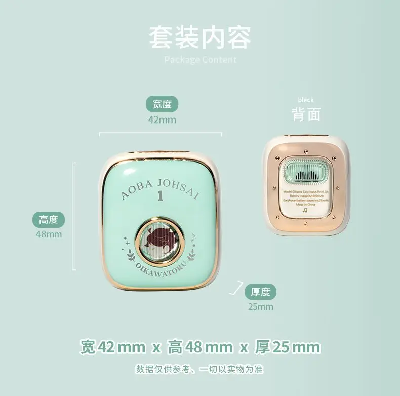 ¿Cómo es la calidad de los auriculares?1.Bluetooth 5.32.Baja latencia3.Potente compatibilidad con iOS/Android4.Reducción de ruido inteligente5.Calidad de sonido HIFI6.Batería de larga duración7.Cambio maestro esclavo8.Retirar y conectar inmediatamente9.Voz original del personaje temático.¿Se pueden guardar los auriculares en el bolso?El tamaño de este auricular es 5x4,1x2,5 cm.La bolsa para auriculares puede caber más grande que el tamaño de los auriculares.Lista de embalaje:1x auriculares1 cable de carga tipo c1x caja de embalaje1x instrucciones