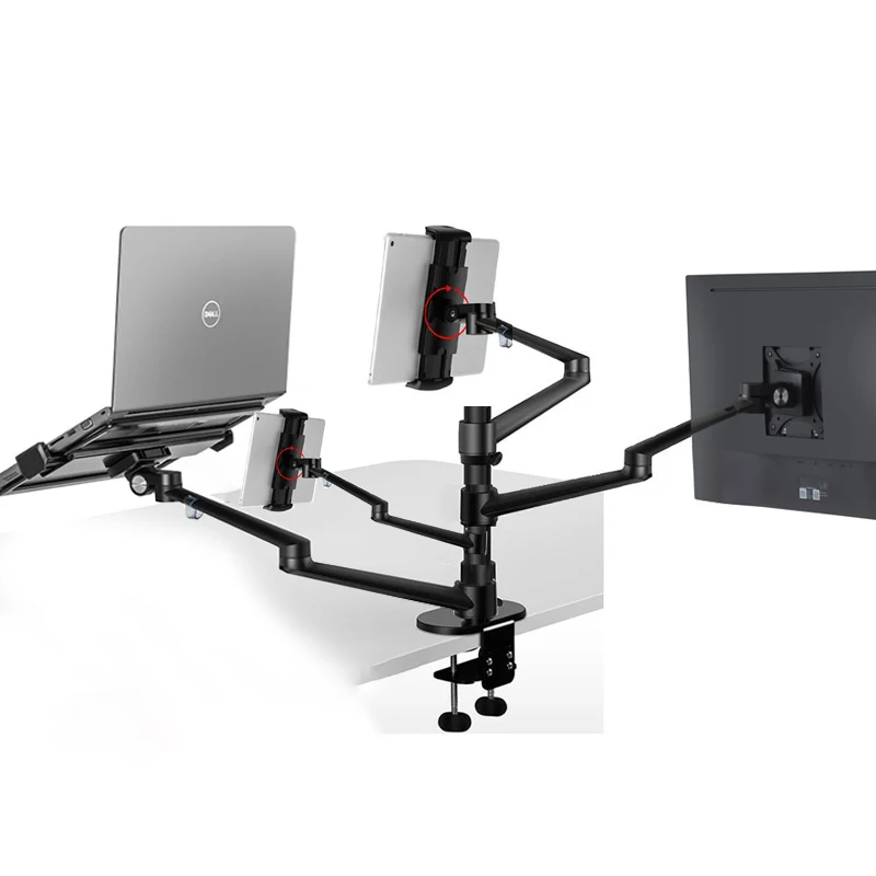 Incluye: 4 brazos; una bandeja para portátil, un soporte para monitor VESA, dos soportes para tablet PC