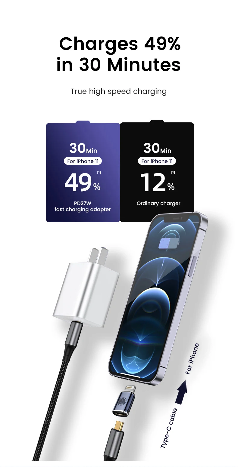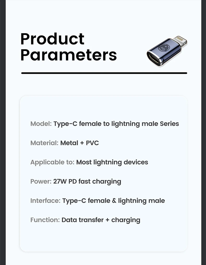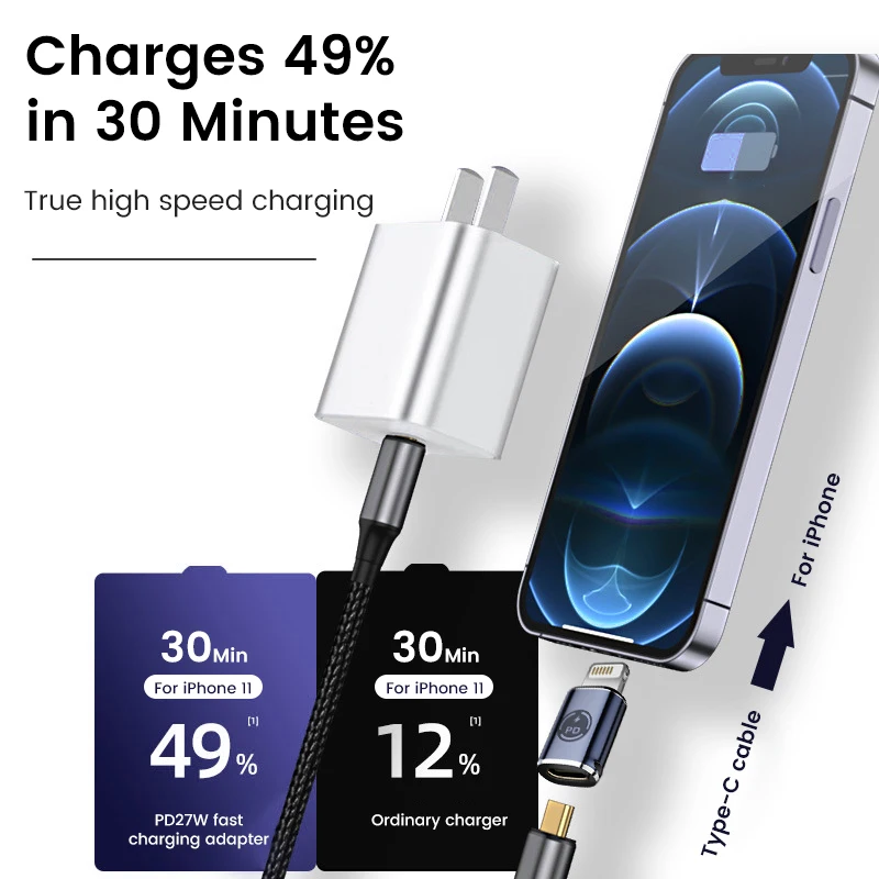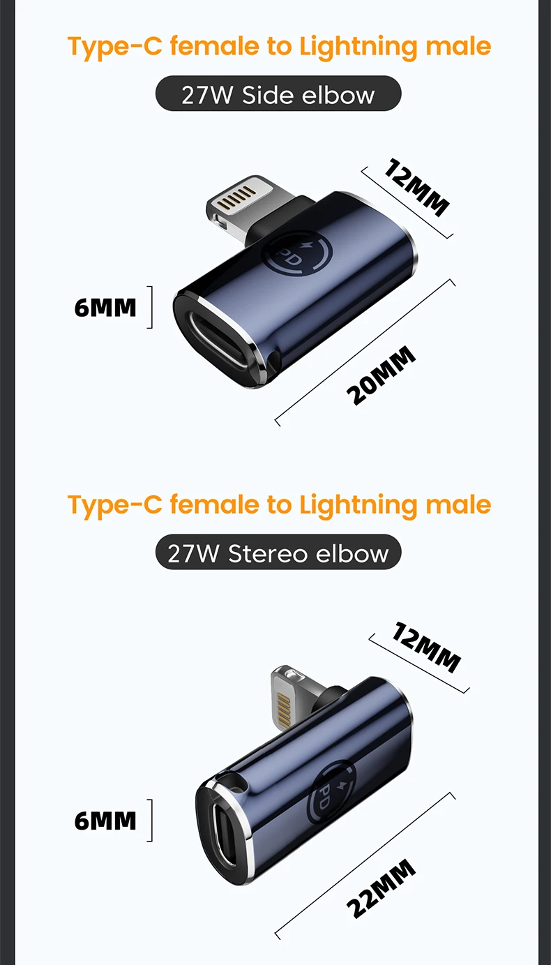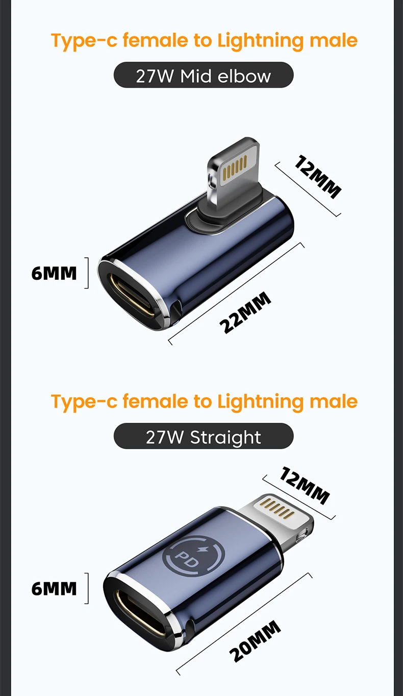 1. Entrada hembra C salida macho Lightning, corriente de carga rápida máxima Pd27w.