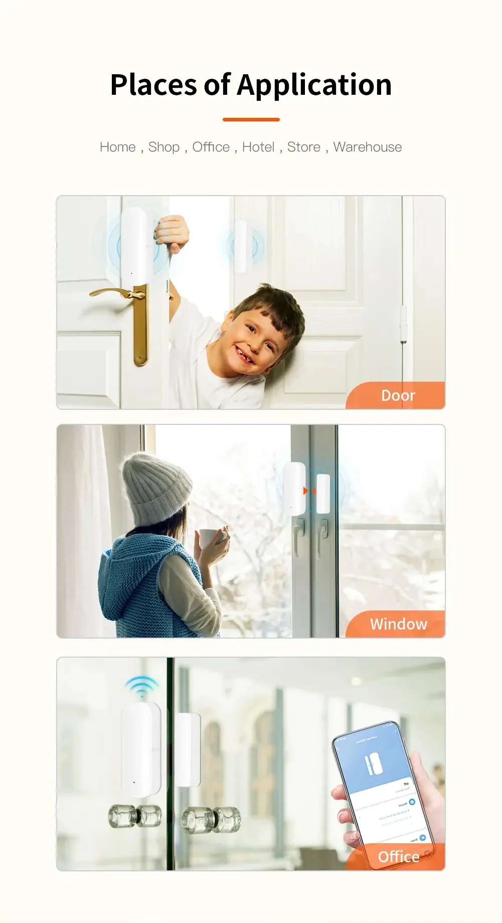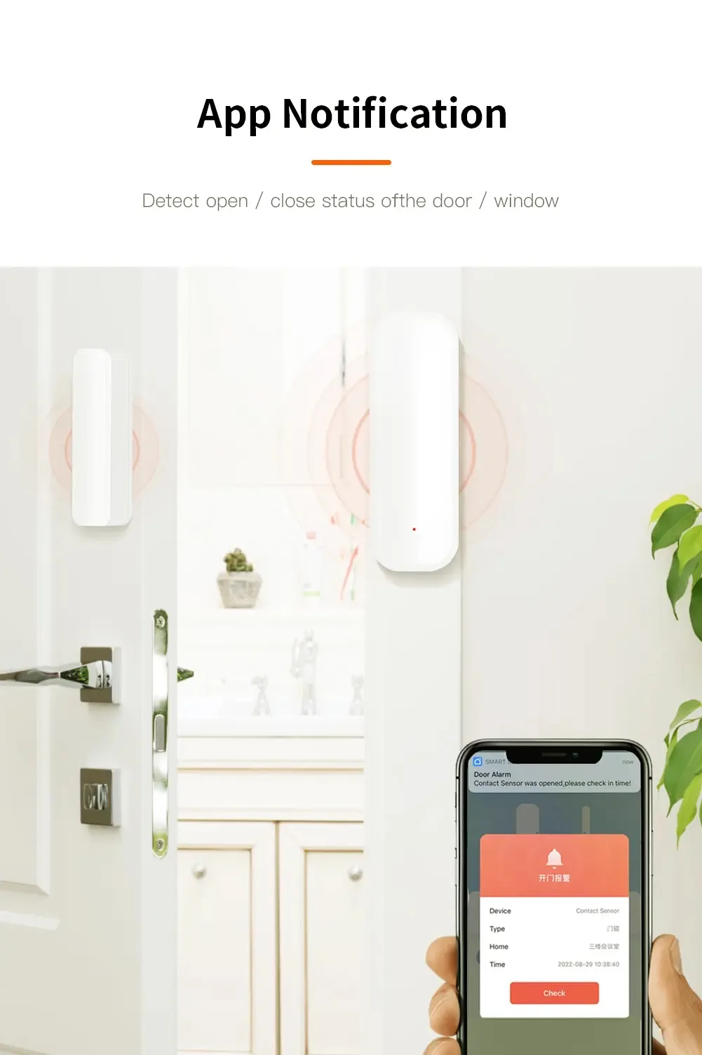 Empuje notificación instantánea a su teléfono inmediatamente cuando la puerta o ventana se abre o se cierra. Mantenerte informado todo el tiempo.
