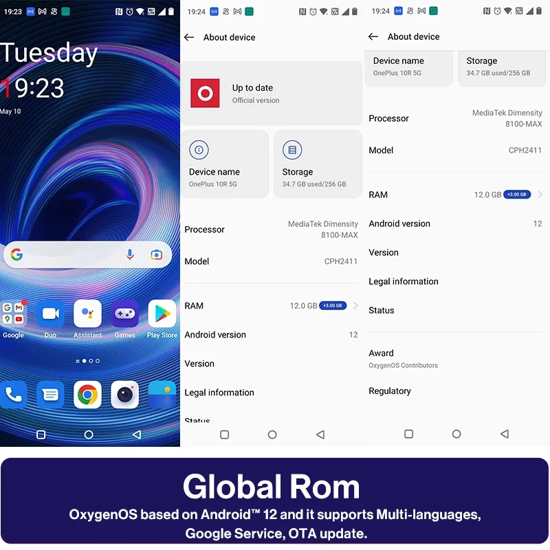 OxygenOS basado en Android™12 y es compatible con varios idiomas, servicio de Google, OTA