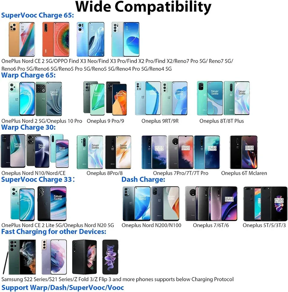 Carga Warp 65: OnePlus Nord CE 2 / Nord 2 5G / 9 / 9 Pro / 9R / 8T / 8T+ 5G