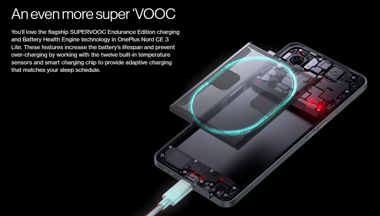 Te encantará la carga insignia SUPERVOOC Endurance Edition y la tecnología Battery Health Engine en OnePlus Nord CE 3 Lite. Estas características aumentan la vida útil de la batería y evitan la sobrecarga al trabajar con los doce sensores de temperatura incorporados y el chip de Carga inteligente para proporcionar una carga adaptativa que coincida con su horario de sueño.