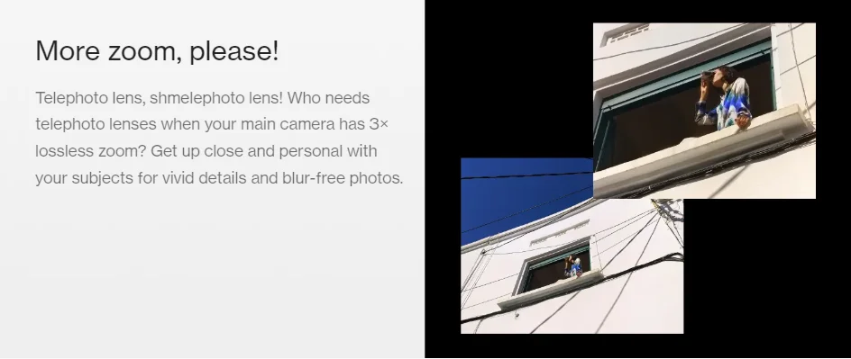 ¡Teleobjetivo, lente shmelephoto! ¿Quién necesita teleobjetivos cuando su Cámara principal tiene un zoom sin pérdidas de 3 ×? Conozca de cerca y personalmente a sus sujetos para obtener detalles vívidos y fotos sin desenfoque.