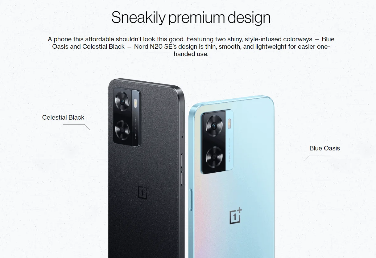 Un dispositivo tan asequible no debería verse tan bien. Con dos combinaciones de colores brillantes e infundidos con estilo-Blue Oasis y Celestial Black-El DISEÑO DE Nord N20 SE es delgado, suave y liviano para facilitar el uso con una sola mano.