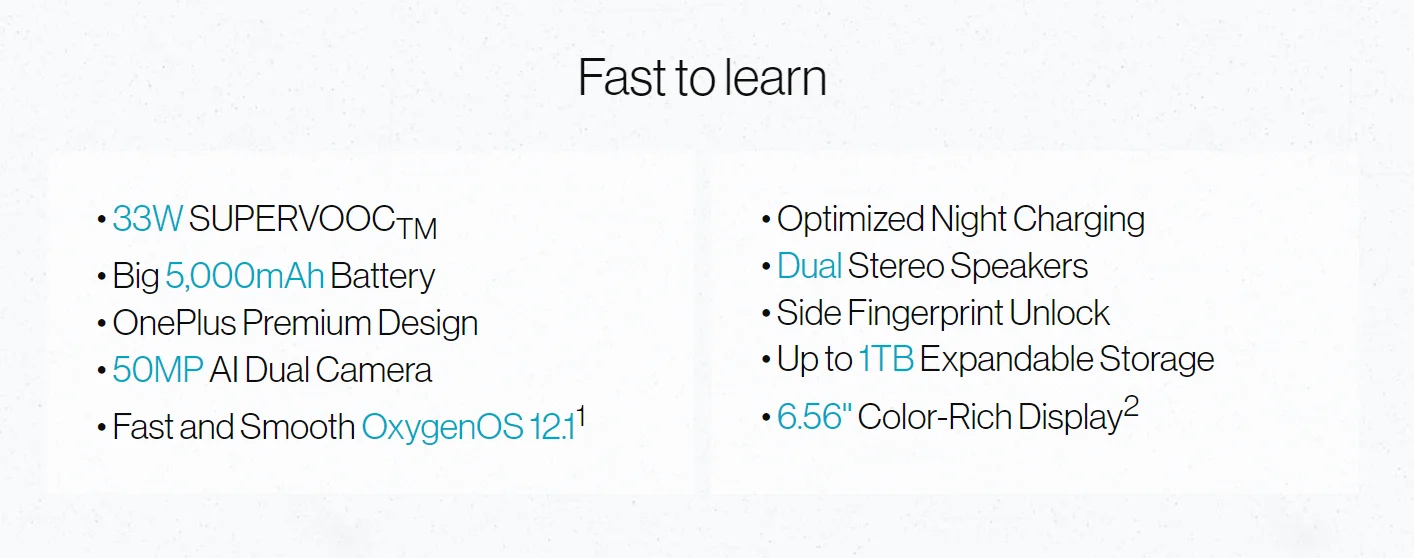 OxygenOS 12,1, desbloqueo facial, compatible con varios idiomas/Servicio de Google/actualización OTA, Bluetooth 5,3, altavoz dual.