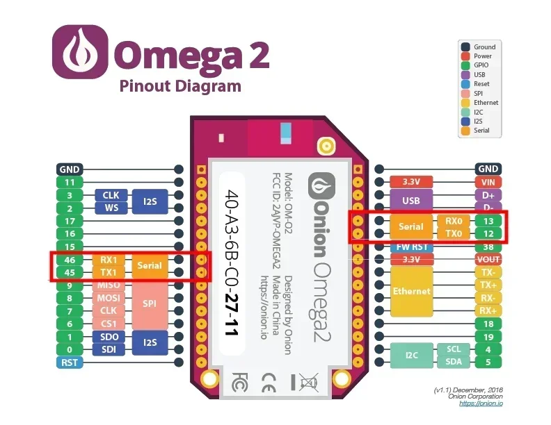 Omega fue construido para interactuar con otro hardware, por lo que tiene una amplia variedad de interfaces de hardware. Tiene pines dedicados para USB2.0 y Ethernet, así como 12 pines GPIO que pueden ser controlados por el usuario. Estos GPIO pueden admitir los protocolos de comunicación serie I2C, UART y SPI.