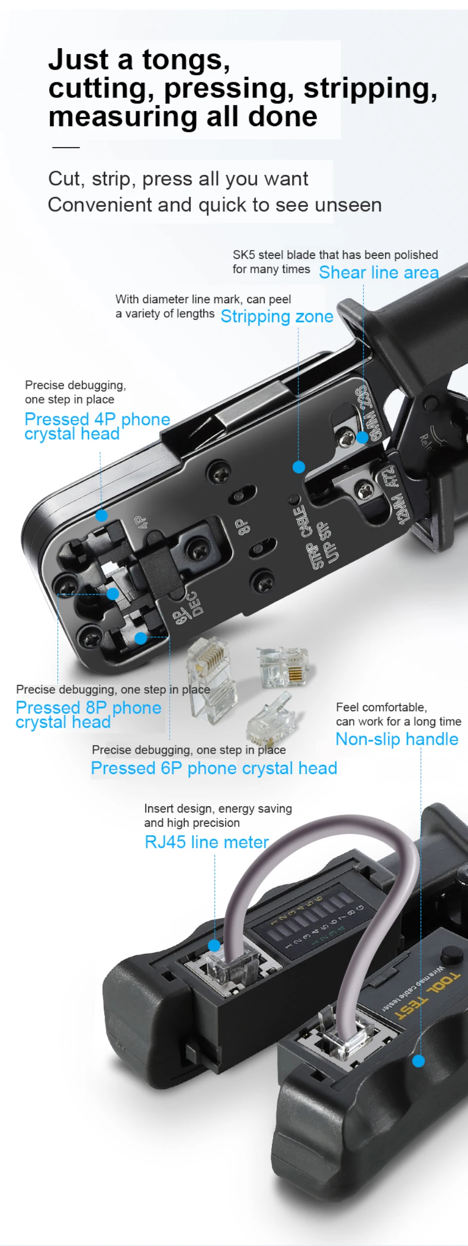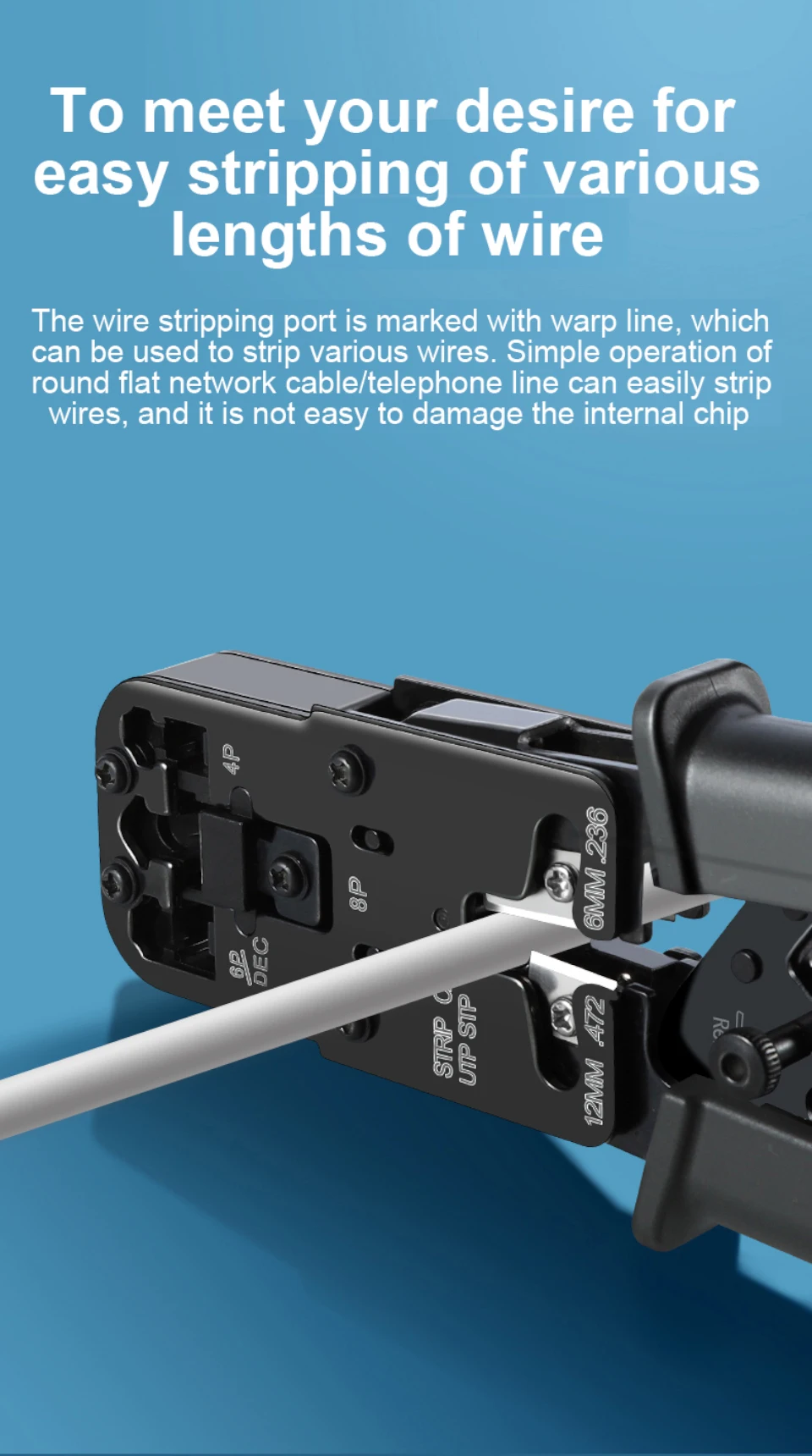 El puerto de pelado de cables está marcado con una línea de urdimbre, que se puede utilizar para pelar varios cables. La operación simple de cable de red plano redondo/línea telefónica puede pelar fácilmente los cables y no es fácil dañar el chip interno.