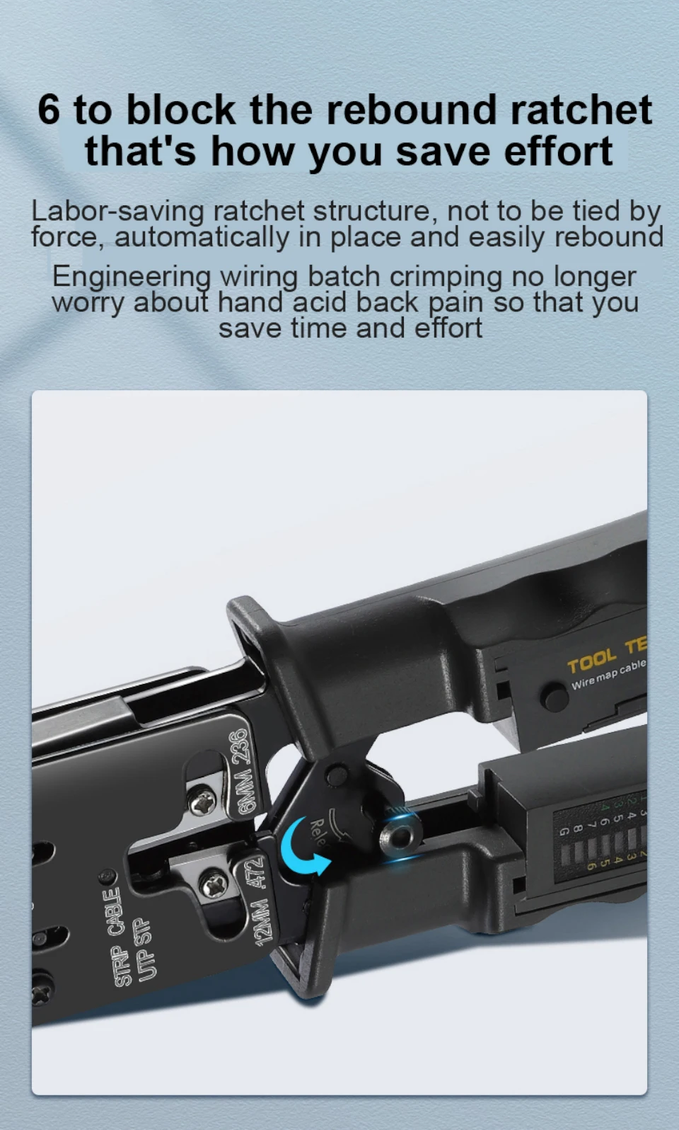 Estructura de trinquete que ahorra trabajo, no se ata a la fuerza, se coloca automáticamente en su lugar y rebota fácilmente. El cableado de ingeniería por lotes ya no se preocupa por el dolor de espalda ácido en las manos para ahorrar tiempo y esfuerzo.