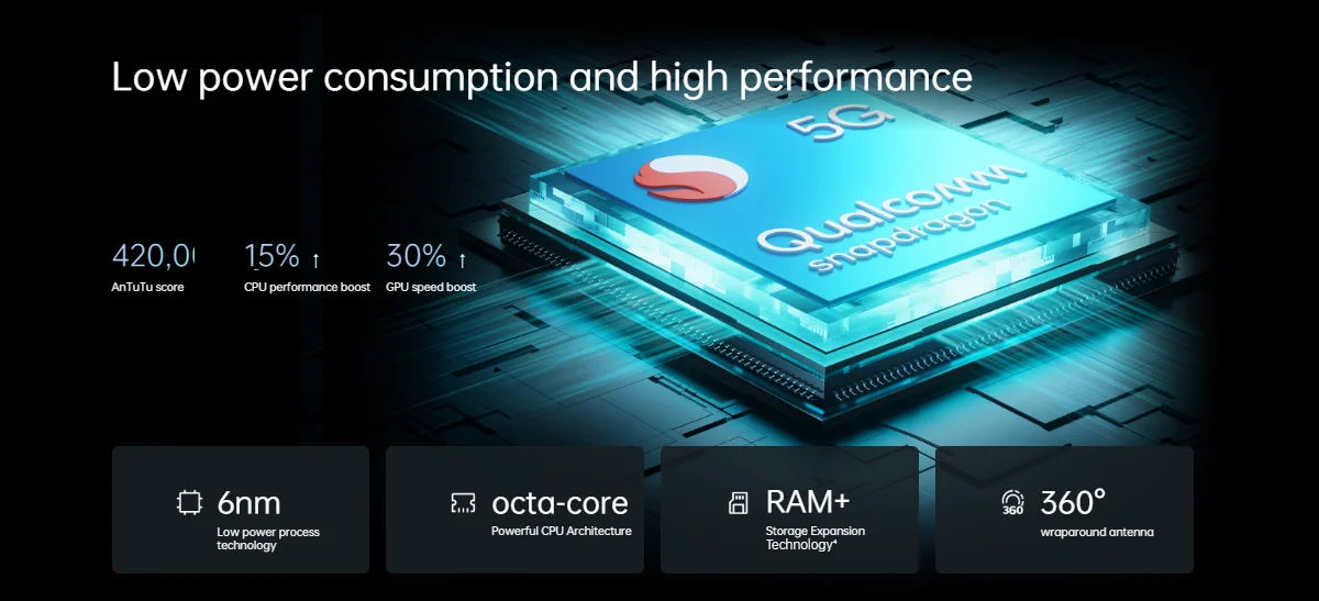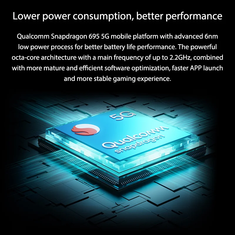 Plataforma móvil Qualcomm Snapdragon 695 5G, tecnología avanzada de proceso de baja potencia de 6nm, para mejorar la duración de la batería. Potente arquitectura de ocho núcleos con una frecuencia principal de hasta 2,2 GHz, con una optimización de software más madura y eficiente, la aplicación se inicia más rápido y la experiencia de juego es más estable.