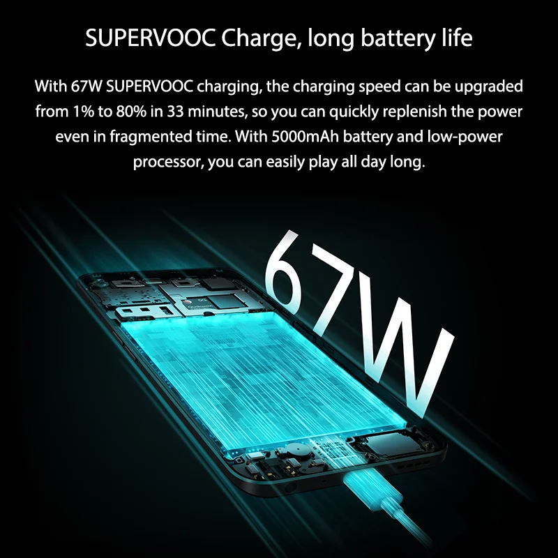 Se agrega la carga súper flash de 67W y la velocidad de carga se actualiza nuevamente. Se puede cargar de 1% a 80% en 33 minutos, y la energía se puede reponer rápidamente durante el tiempo de fragmentación². Con una Batería grande de 5000mAh y un procesador de bajo consumo, puedes jugar fácilmente todo el día.