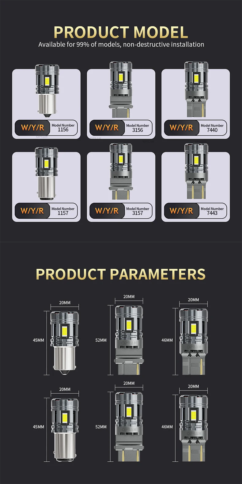 ※ Aplicación: luces intermitentes, luces de freno, luces traseras, luz de marcha atrás, luces de posición laterales, luces de esquina, luces intermitentes, etc.(No aplicable a DRL)