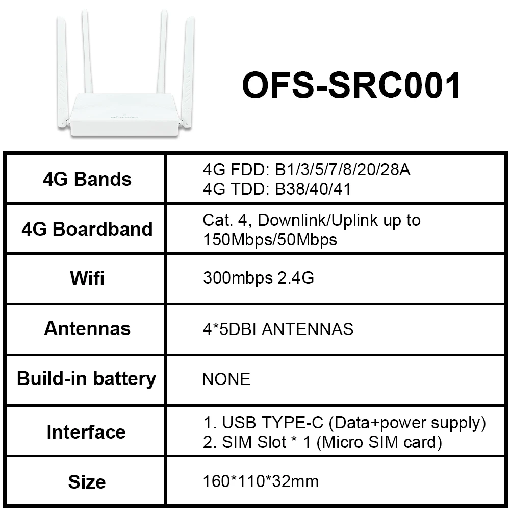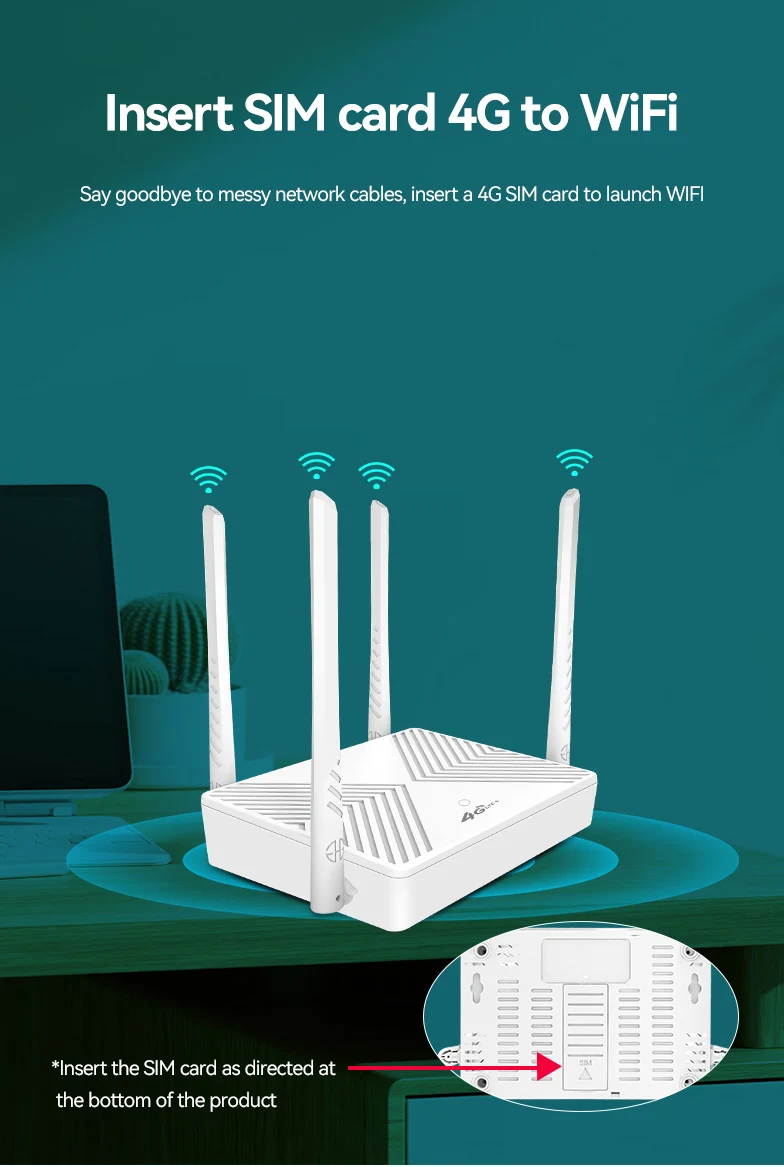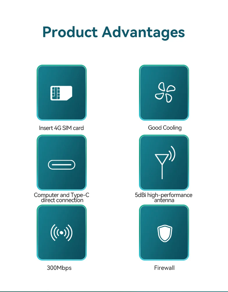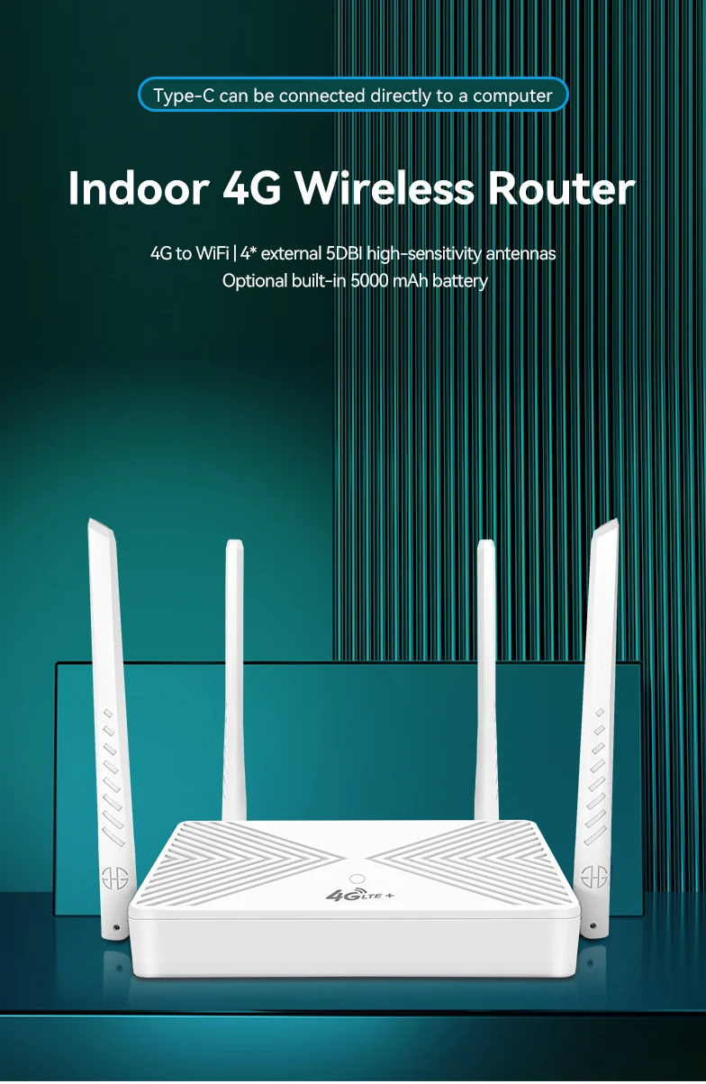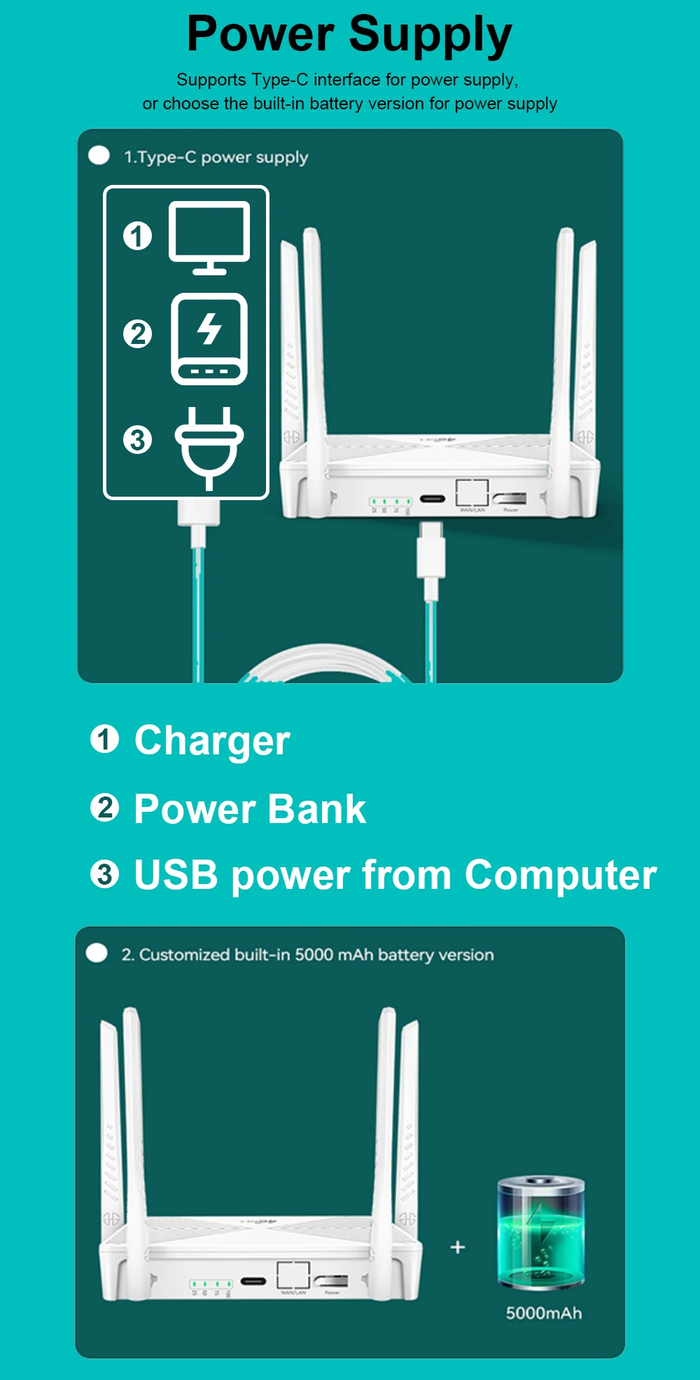 El enrutador 4G accede a Internet a través de la conexión telefónica de comunicación móvil 4G o la banda de placa a través del puerto USB tipo C.El dispositivo tiene un módem 3G/4G incorporado; antes de usarlo, solicite una tarjeta SIM 4G local e insértela en el enrutador.