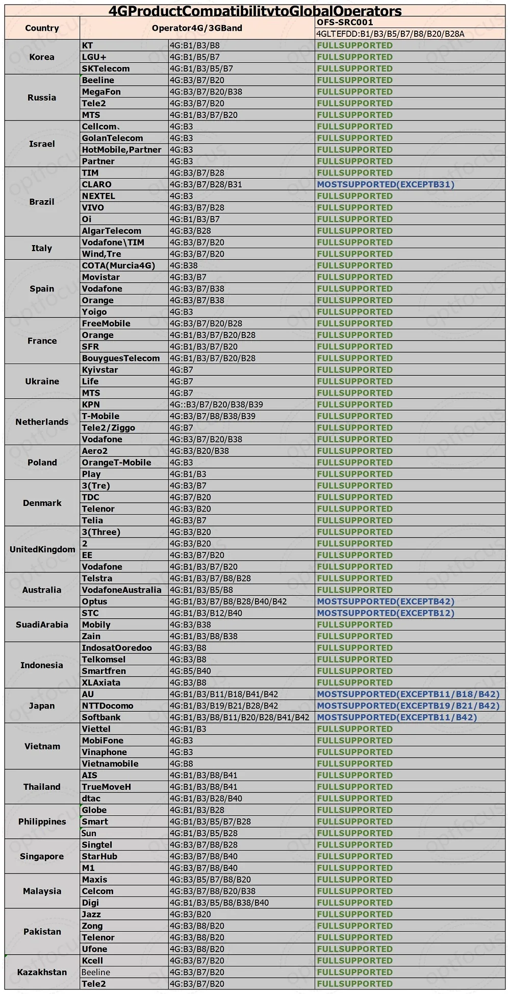 4G LTE FDD: B1/B3/B5/B7/B8/B20/B28A (2100/1800/850/2600/900/800/700 MHZ)