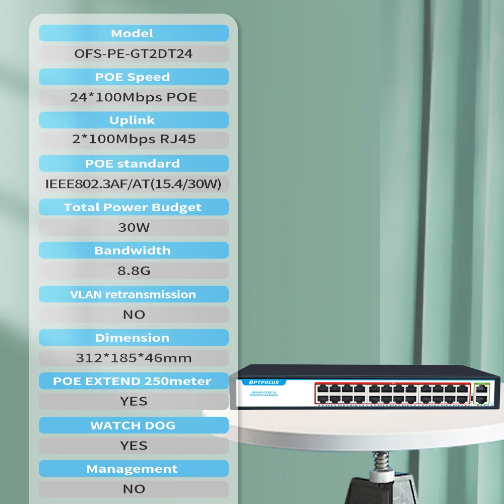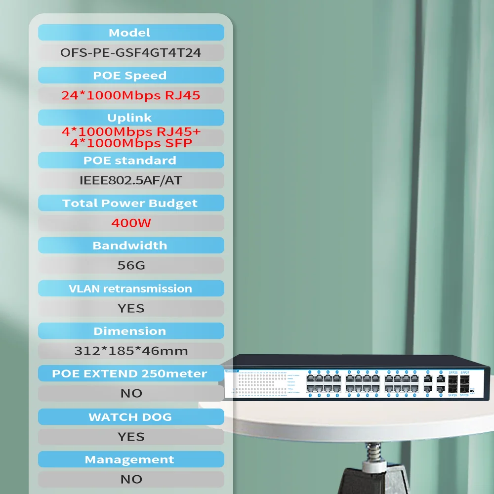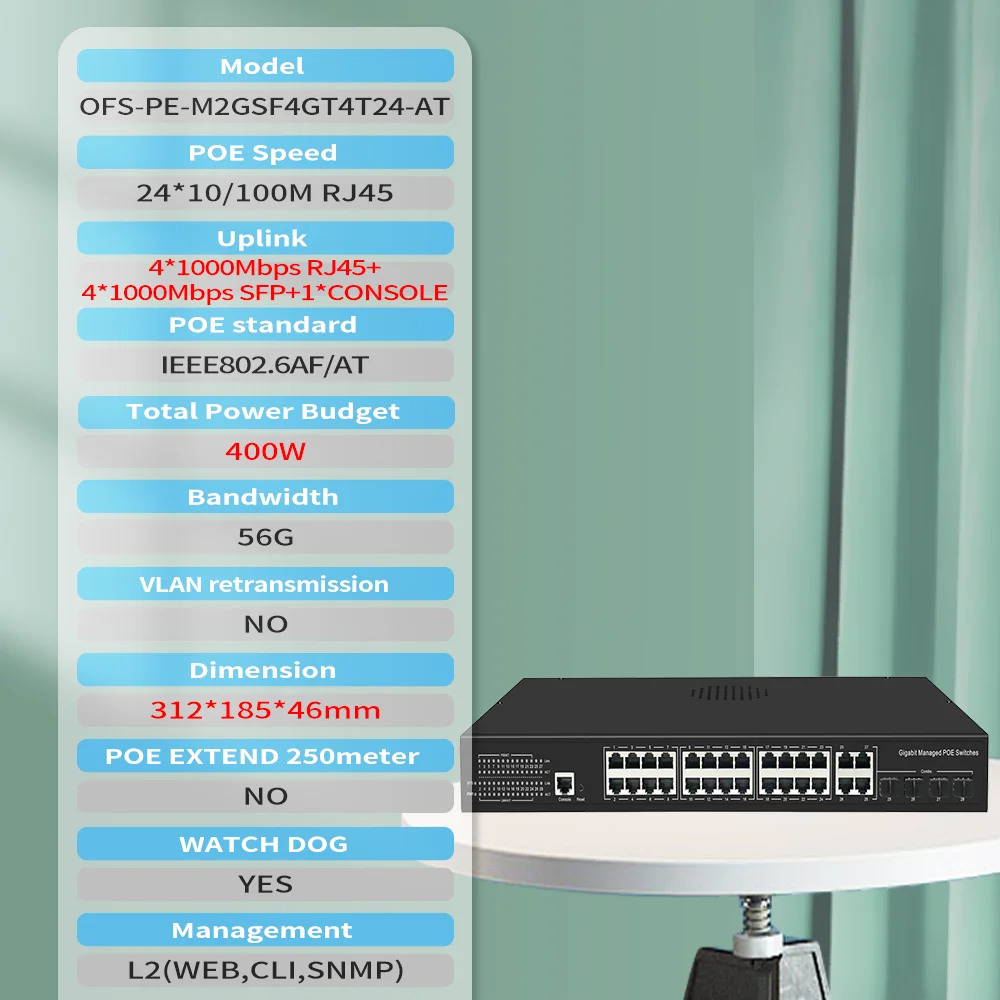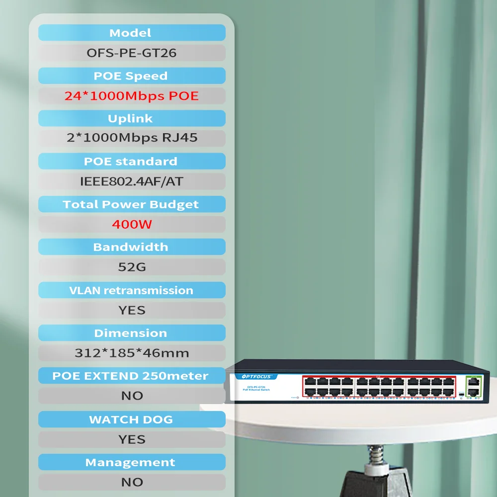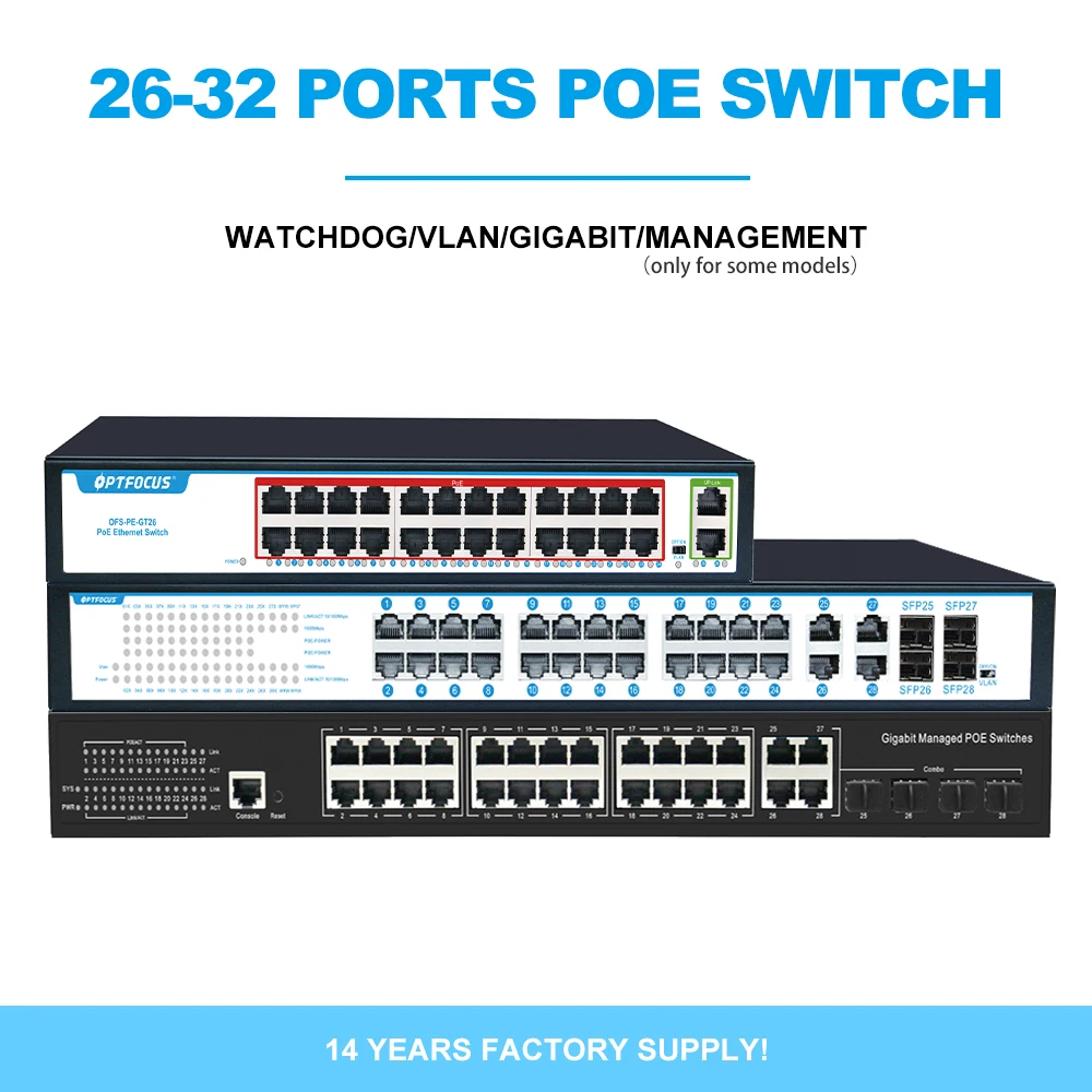 Comprar OPTFOCUS-conmutador inteligente de fibra óptica de 24 puertos, conmutador POE de 1000mbps para cámaras IP, 400W, 48V, Gigabit, SFP, rj45