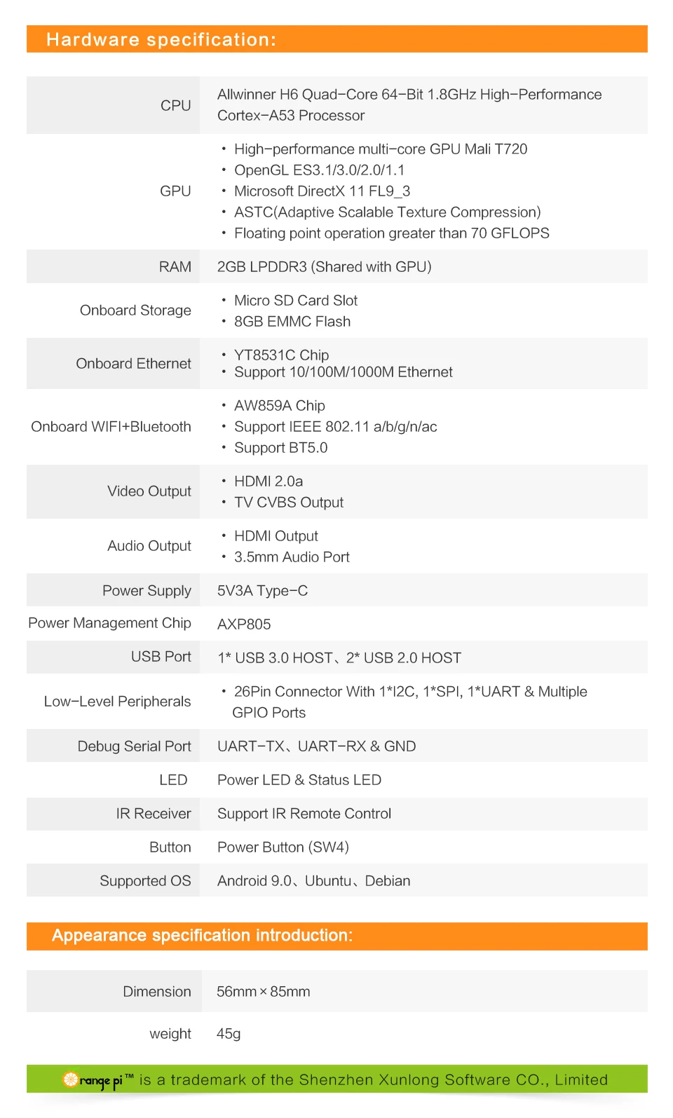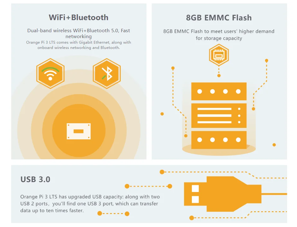 Orange Pi 3 LTS uses the Allwinner H6 SoC, and has 2GB LPDDR3 SDRAM, 8GB EMMC Flash. It can run Android 9,Ubuntu,Debian. Orange Pi 3 LTS offers a range of different ports, including HDMI-compatible output, 26pin headers, Gbps Ethernet port,1*USB 3.0, 2* USB2.0,etc. It is powered through Type-C. It is a good choice for applications that need strong networking perfomance.