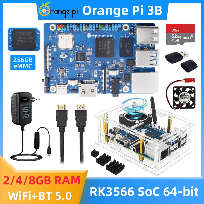 NUEVO Orange Pi 3B Rockchip RK3566 64-bit 2/4/8 GB RAM Opcional 256G EMMC Caja Ventilador Disipador de calor Fuente de alimentación Tarjeta SD para OPI 3B