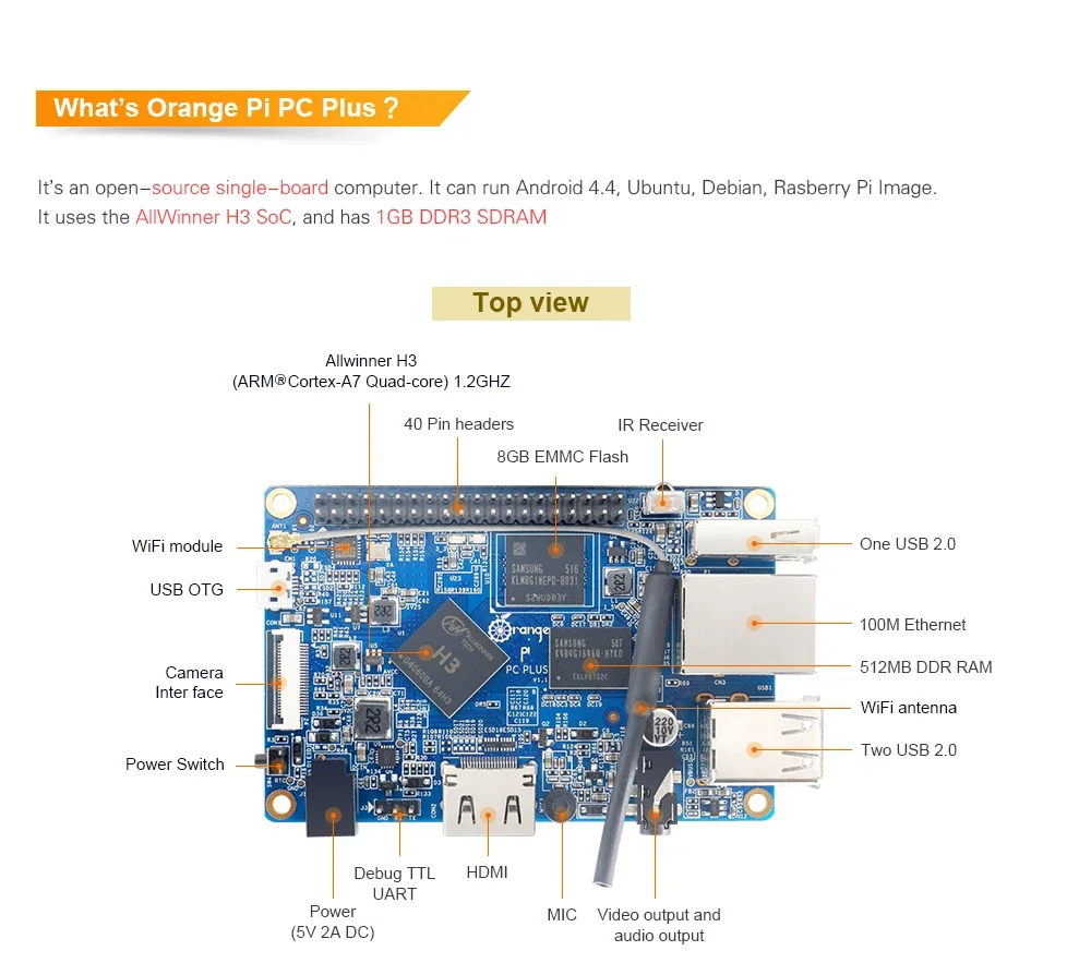Orange Pi PC Plus + Caja ABS transparente + Kit de fuente de alimentación Execución Android 4.4 Ubuntu Debian Image