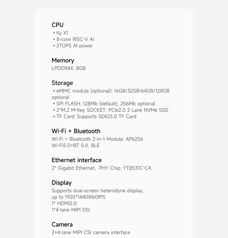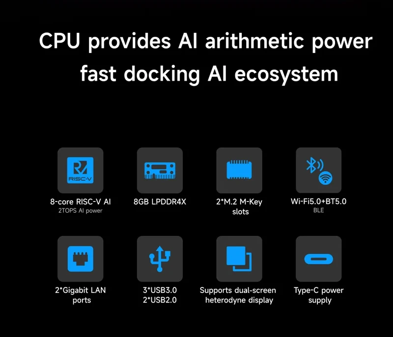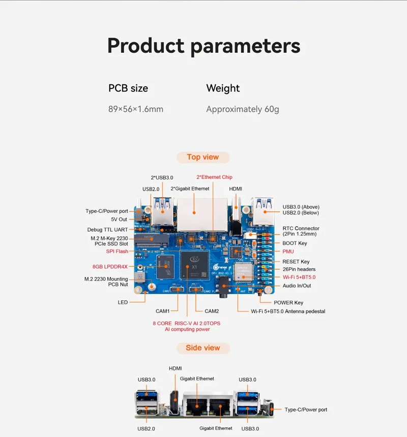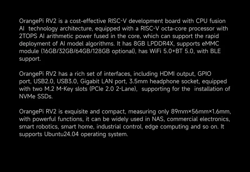 Orange Pi RV2 8 núcleos RISC-V 2TOPS AI CPU Computadora de placa única 2GB 4GB 8GB RAM LPDDR4 Opcional WiFi BT5.0 M2 PCIE SSD Mini PC