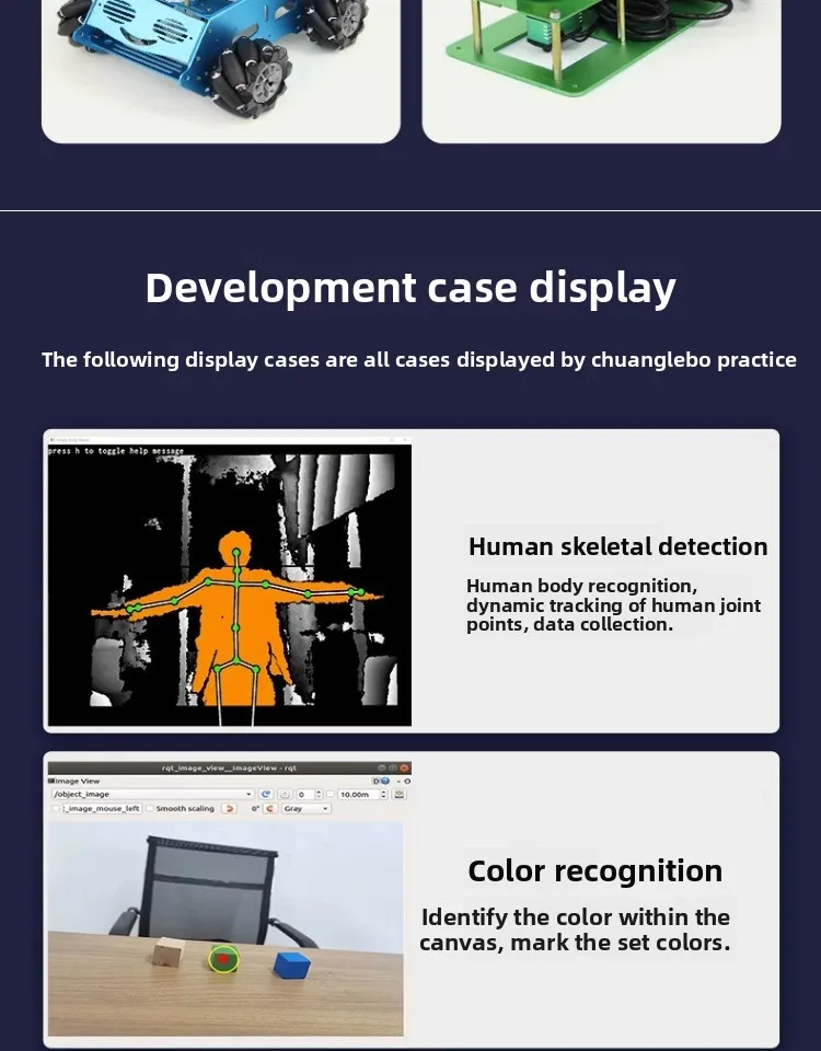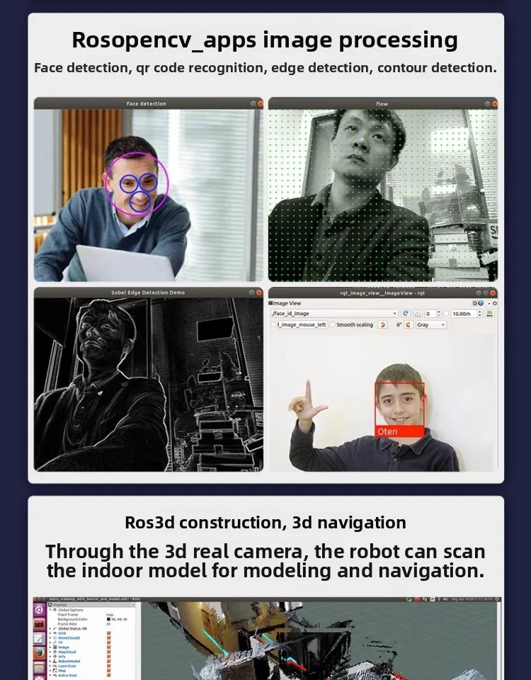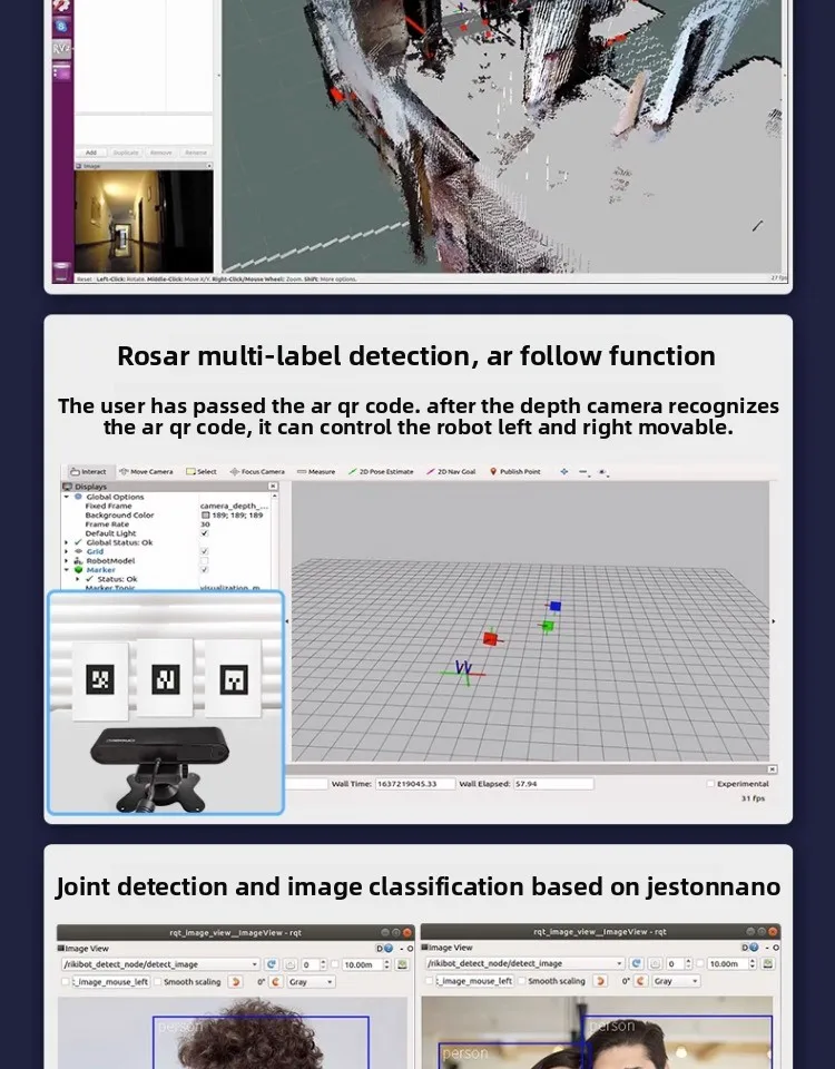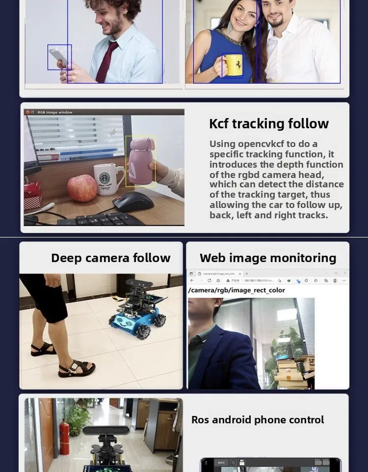 Aplicación: - Detección de esqueleto humano: reconocimiento humano, seguimiento dinámico de puntos de articulación humana, recopilación de datos. - Reconocimiento de colores: identifique los colores dentro de la gama de lienzos y marque los colores del conjunto. - Para el procesamiento de imágenes ROS OpenCV_APPS: capaz de detectar rostros, reconocer códigos QR, detectar bordes y detectar contornos. - Para el mapeo 3D ROS y la navegación 3D: utilizando una cámara realista 3D, el robot escanea los modelos de interior para el modelado y la navegación. -Para la detección de etiquetas múltiples ROS AR, función de seguimiento AR: los usuarios pueden usar códigos AR QR y cámaras de profundidad para reconocer los códigos AR QR y realizar el seguimiento AR, que puede controlar que el robot se mueva hacia la izquierda y hacia la derecha. - Detección de objetos y clasificación de imágenes basada en el uso de Jeston Nano. - Seguimiento y seguimiento de KCF: utilizando Opencv KCF para funciones de seguimiento específicas e introduciendo la función de profundidad de las cámaras RGBD, puede detectar la distancia del objetivo rastreado, permitiendo que el automóvil realice un seguimiento y seguimiento en todas las direcciones. - La cámara de profundidad sigue. - Monitoreo de imágenes web. - Para control de teléfono ROS Android.