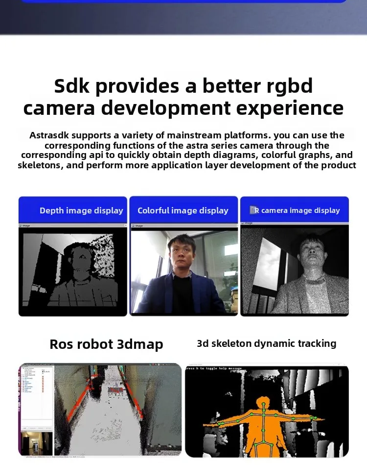 Características: - El SDK Astra admite múltiples plataformas convencionales y las funciones correspondientes de las cámaras de la serie Astra se pueden utilizar a través de las API correspondientes para obtener rápidamente mapas de profundidad, mapas de colores y esqueletos, lo que permite un mayor desarrollo de la capa de aplicación del producto. - Admite cambiar entre chino e inglés, ver flujos de datos básicos, visualizar nubes de puntos y otra información para lograr funciones de control láser, guardado de imágenes y grabación de video. - Compatible con los sistemas ROS1 y ROS2, proporcionando SDK del sistema ROS1/ROS2 y materiales de programa relacionados (comuníquese con nuestro servicio de atención al cliente para obtener recursos después de recibir el producto). - Desarrollo de SDK compatible múltiple, que brinda soporte múltiple para múltiples idiomas y plataformas, obtiendo fácilmente mapas de profundidad, mapas de colores y esqueletos llamando las APIs correspondientes para el desarrollo del lado de la aplicación de productos personalizados. - El ángulo del soporte de la cámara se puede ajustar y el ángulo de la cámara se puede ajustar abriendo la base. - Desarrollo de expansión del robot: la base Astra Pro Plus está equipada con orificios para tornillos para una fácil fijación y se puede utilizar en robots y automóviles pequeños.Viene con ángulos ajustables hacia arriba y hacia abajo para una mayor flexibilidad.