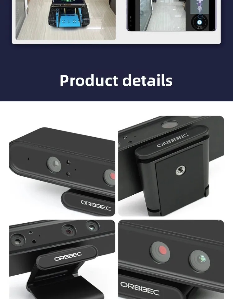 Cámara de profundidad ORBBEC Astra/Astra Plus/Astra Pro Plus Cámara de desarrollo de visión 3D Compatible con el sistema ROS1/ROS2 para Jetson/Raspberry Pi Descripción: - El algoritmo de aplicación de la cámara realista Astra 3D puede lograr diversas funciones, como reconocimiento facial y gestos. reconocimiento, seguimiento humano, medición 3D, percepción ambiental y reconstrucción de mapas 3D.Se puede aplicar a diversos escenarios, como entretenimiento en la sala de estar, monitoreo de seguridad, medición, escaneo 3D, interacción con detección de movimiento, exhibición comercial, etc.
