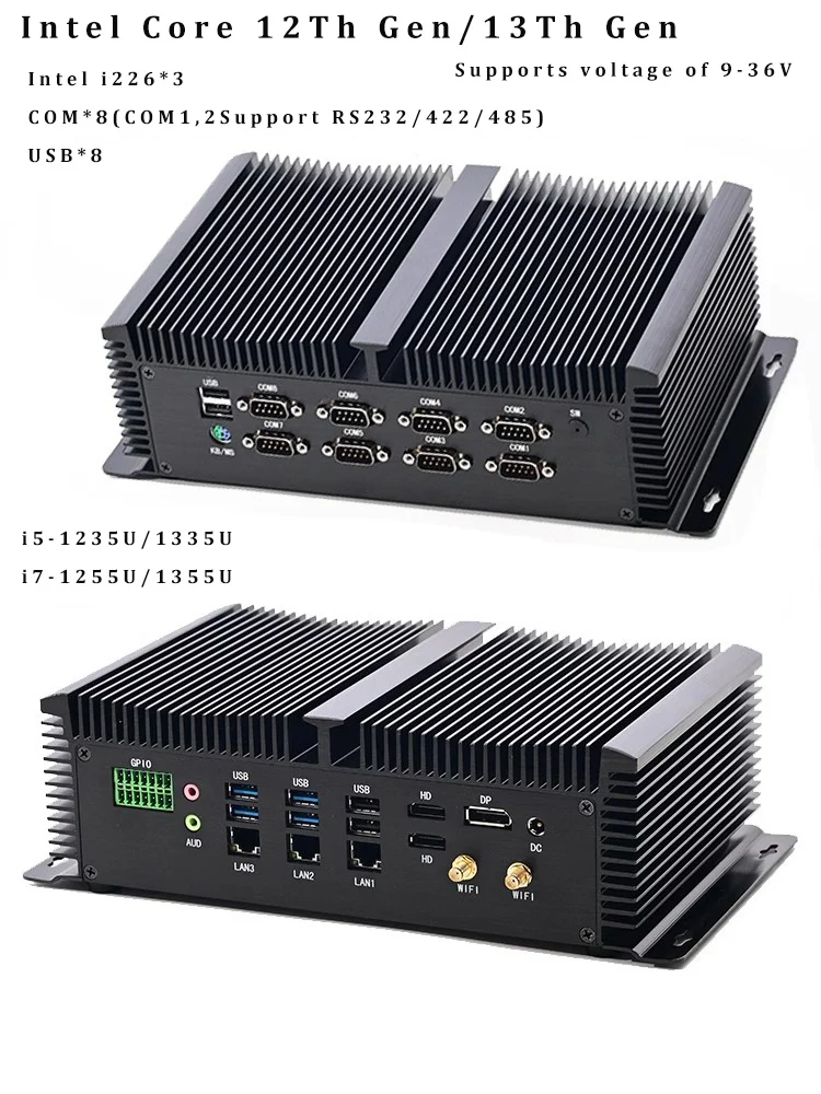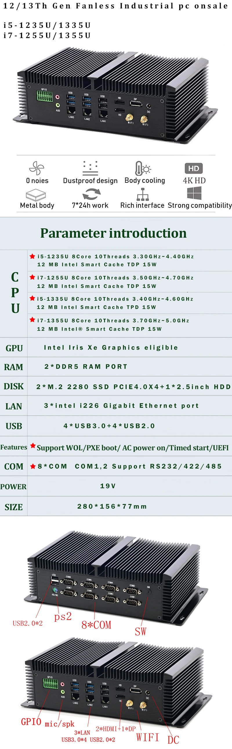 Comprar Ordenador industrial de 13. a generación i5-1335U/i7-1355U 8 COM 3 * LAN 2 * HDMI 1 * DP RS232,422,485 COM USB WIFI PC industrial