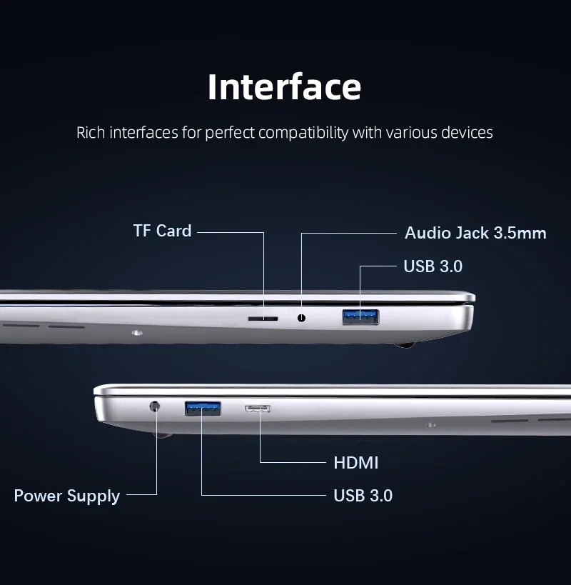 6) Múltiples puertos para satisfacer sus diferentes necesidades: 2 puertos USB 3,0, HDMI, audio, tarjeta de memoria, 1 puerto de carga