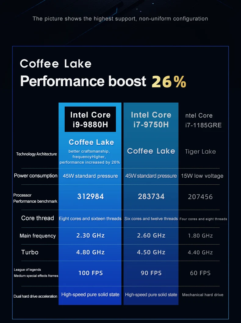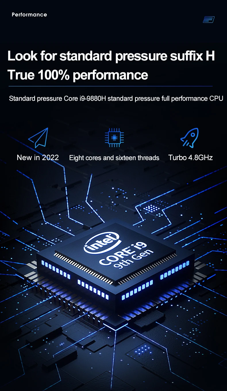 CPU | I9-9880H,6Cores12Threads Velocidad: 2,60 GHz-4,50 GHz |