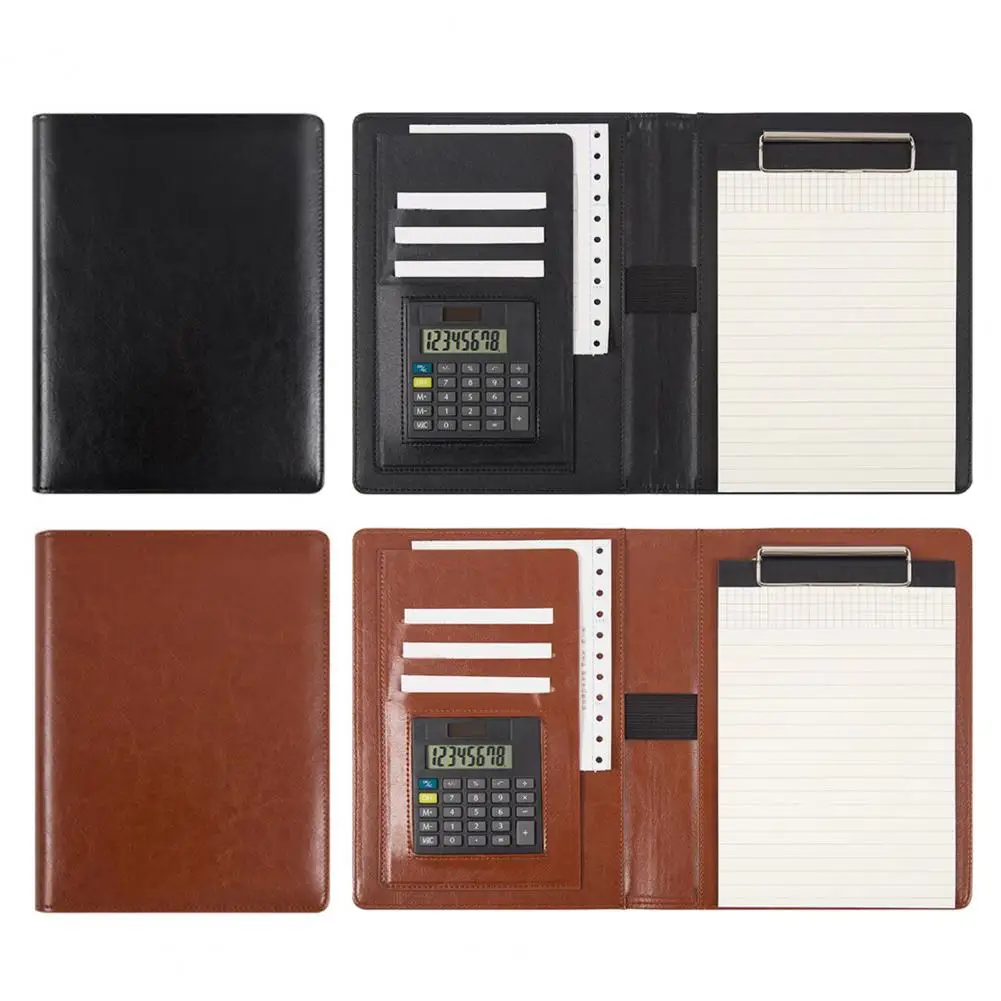 Una carpeta multifuncional se utiliza para satisfacer las necesidades diarias y de la Oficina. Tiene tres ranuras para tarjetas, un kit de información, una calculadora, una ranura para bolígrafos y una abrazadera para tablero.