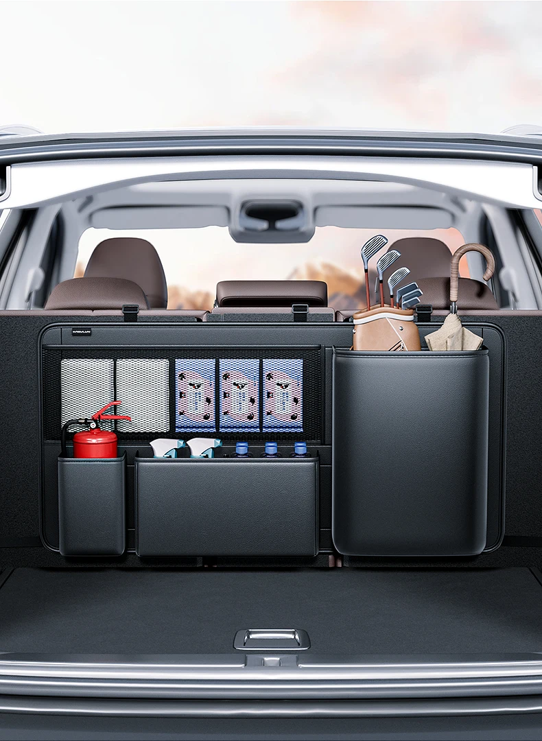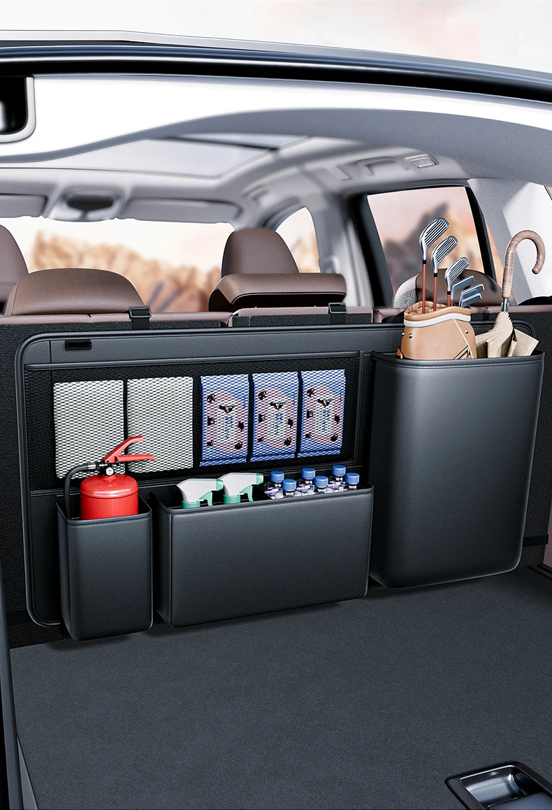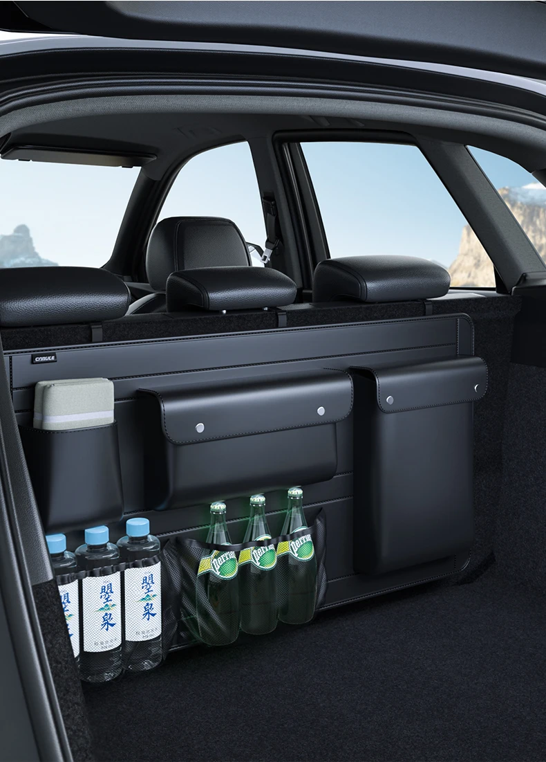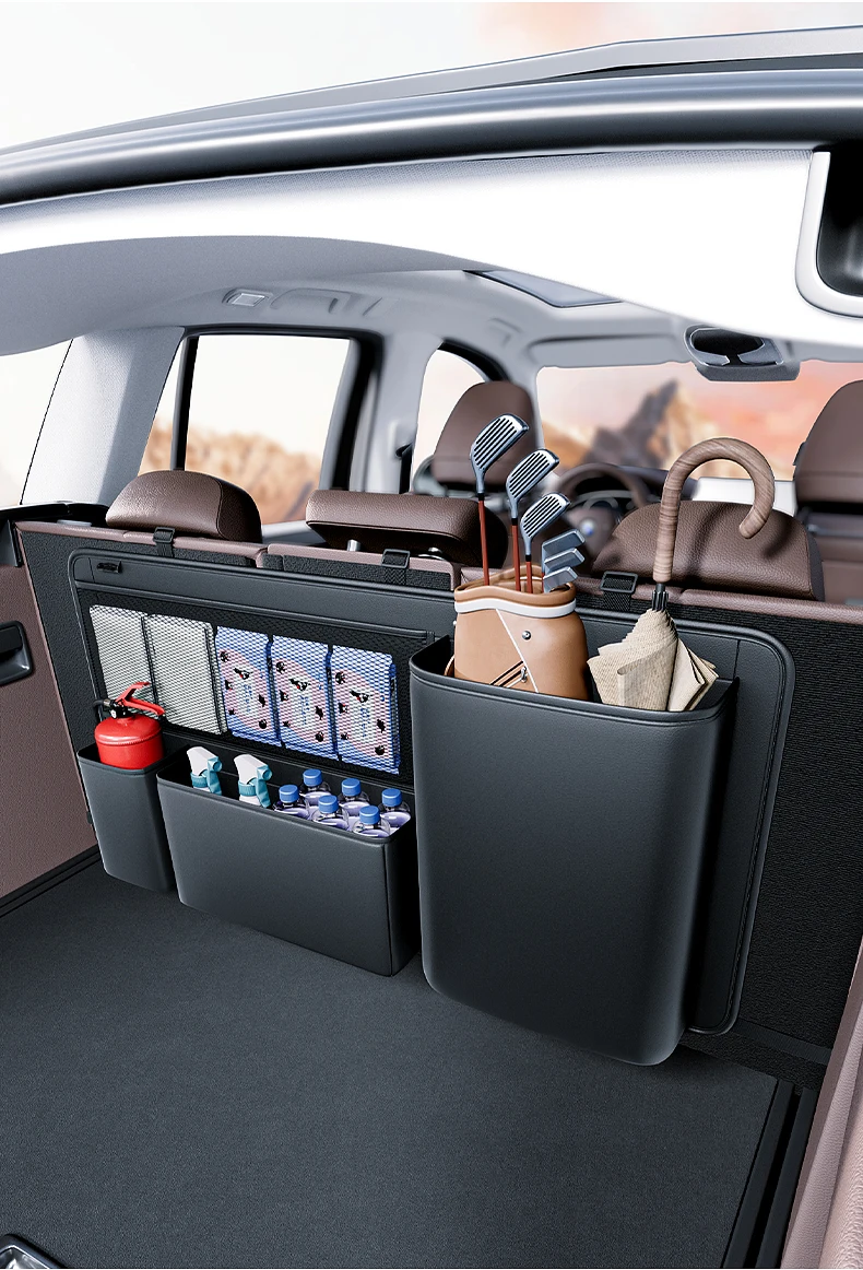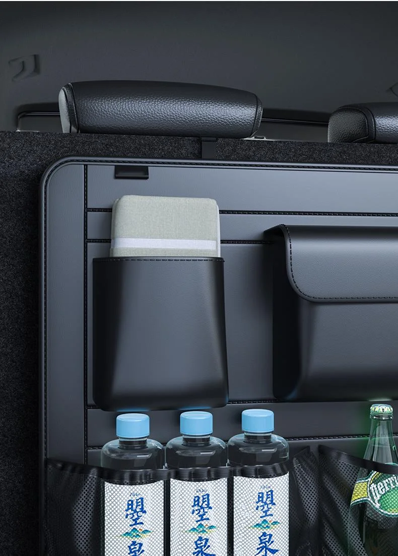Comprar Organizador de asiento trasero de maletero de coche SUV, bolsa de almacenamiento colgante de cuero para asiento de coche, correas ajustables, bolsillos de red para botellas de viaje