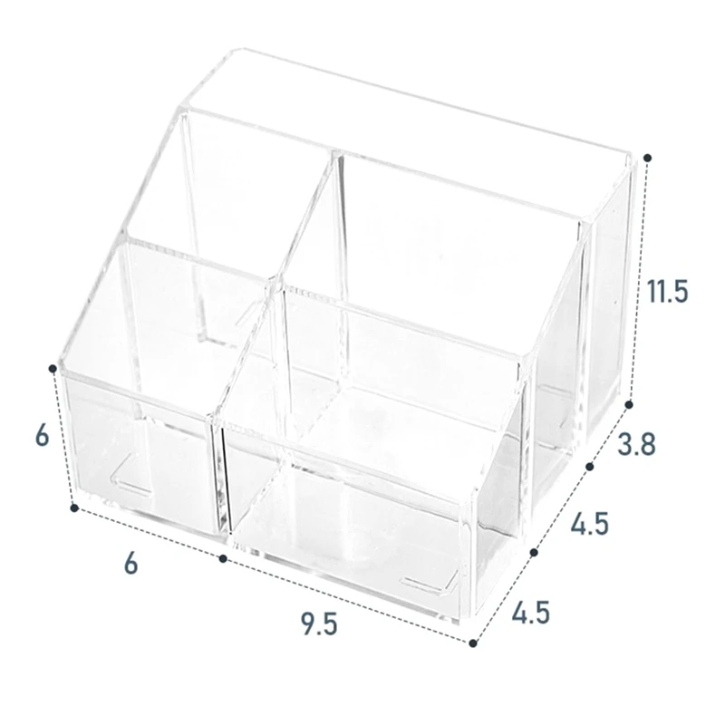 1. El tamaño total (largo x ancho x alto): 6,3 x 5,5 x 4,5 pulgadas (16 x 14 x 11,5 cm).El portalápices transparente para escritorio tiene 5 compartimentos divididos con diferentes espacios y tamaños, y el diseño de gran capacidad de almacenamiento puede satisfacer sus necesidades.