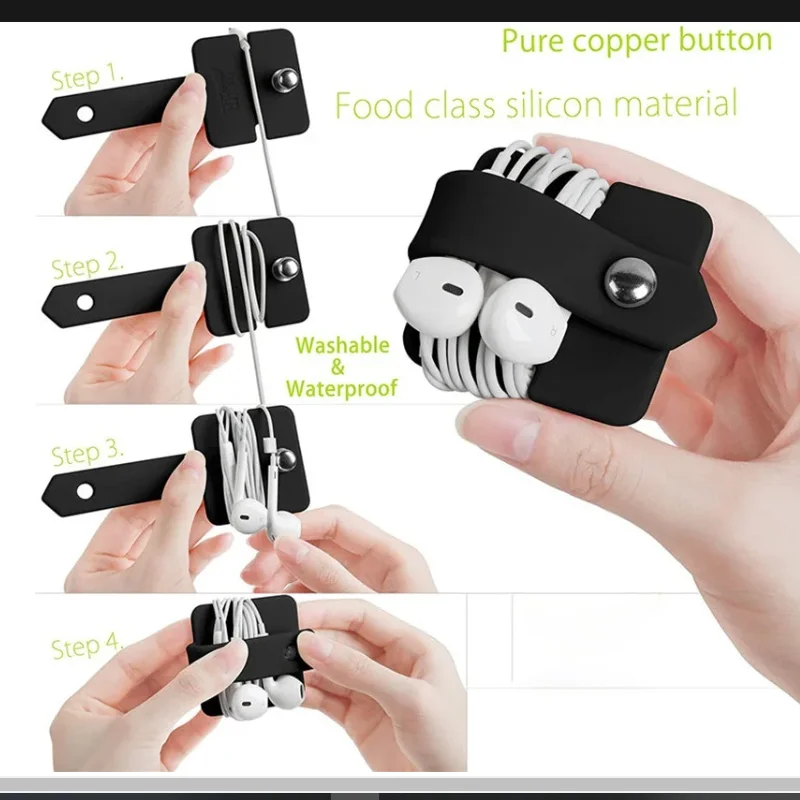 Organizador de auriculares hecho de material de silicona de alta calidad para un uso duradero, reutilizable, duradero y multiusos, el diseño metálico a presión permite una fácil apertura y cierre, libera el cable del auricular desenredado en cuestión de segundos.