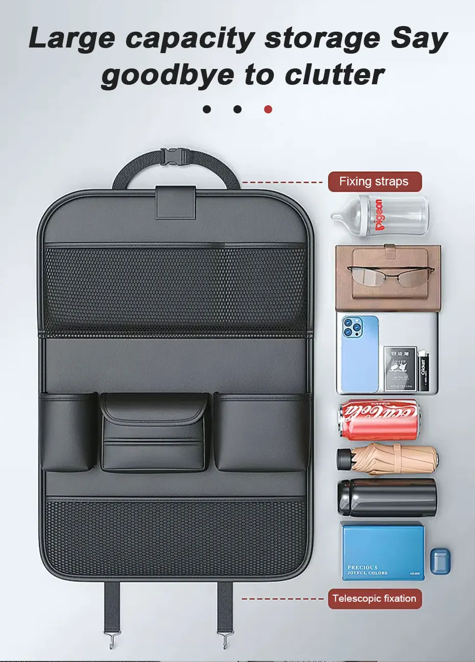 • Diseño multifuncional :Este organizador de respaldo de asiento de coche está diseñado para ser multi-funcional, lo que le permite almacenar una variedad de artículos en una ubicación conveniente.
