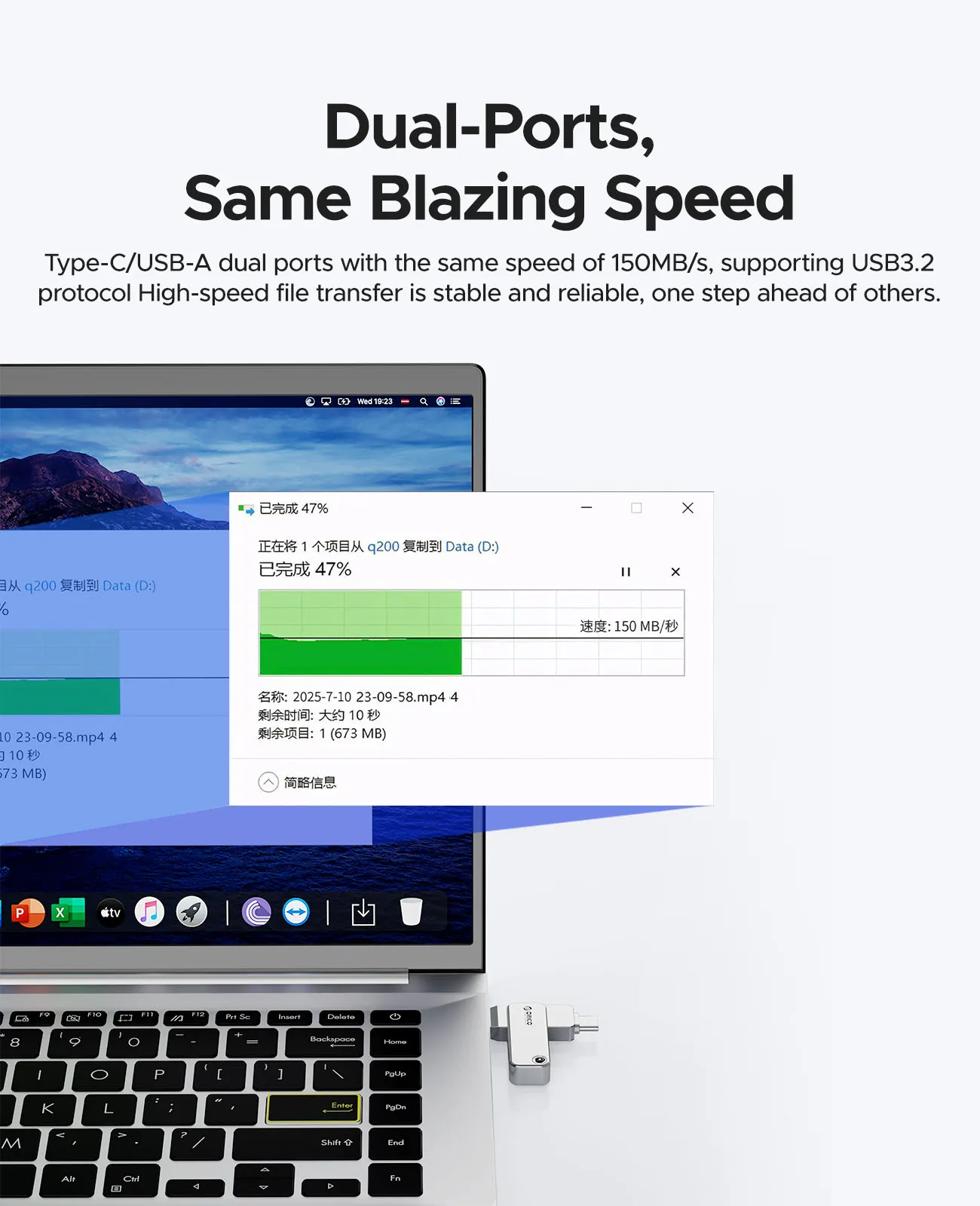 Utilizando el protocolo de transmisión de alta velocidad USB3.2 Gen1, rendimiento USB3.2 Gen1 de alta velocidad de velocidad de lectura máxima 150 MB/s, velocidad de escritura de hasta 70 MB/s.Puedes transferir 1 GB de archivo en menos de 3 segundos.