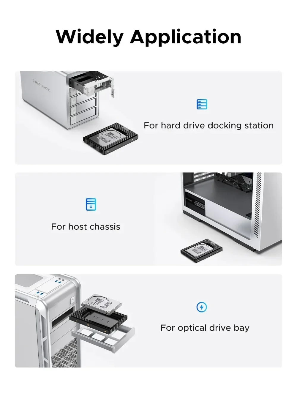 Esta caja adaptadora está diseñada para diversos escenarios.Se puede instalar en el chasis de la computadora para agregar una ranura para disco duro de 2,5 pulgadas, usarse con un gabinete de disco duro para cambiar fácilmente el disco duro o combinarse con una ranura para unidad óptica para proporcionar opciones de almacenamiento adicionales para su computadora.