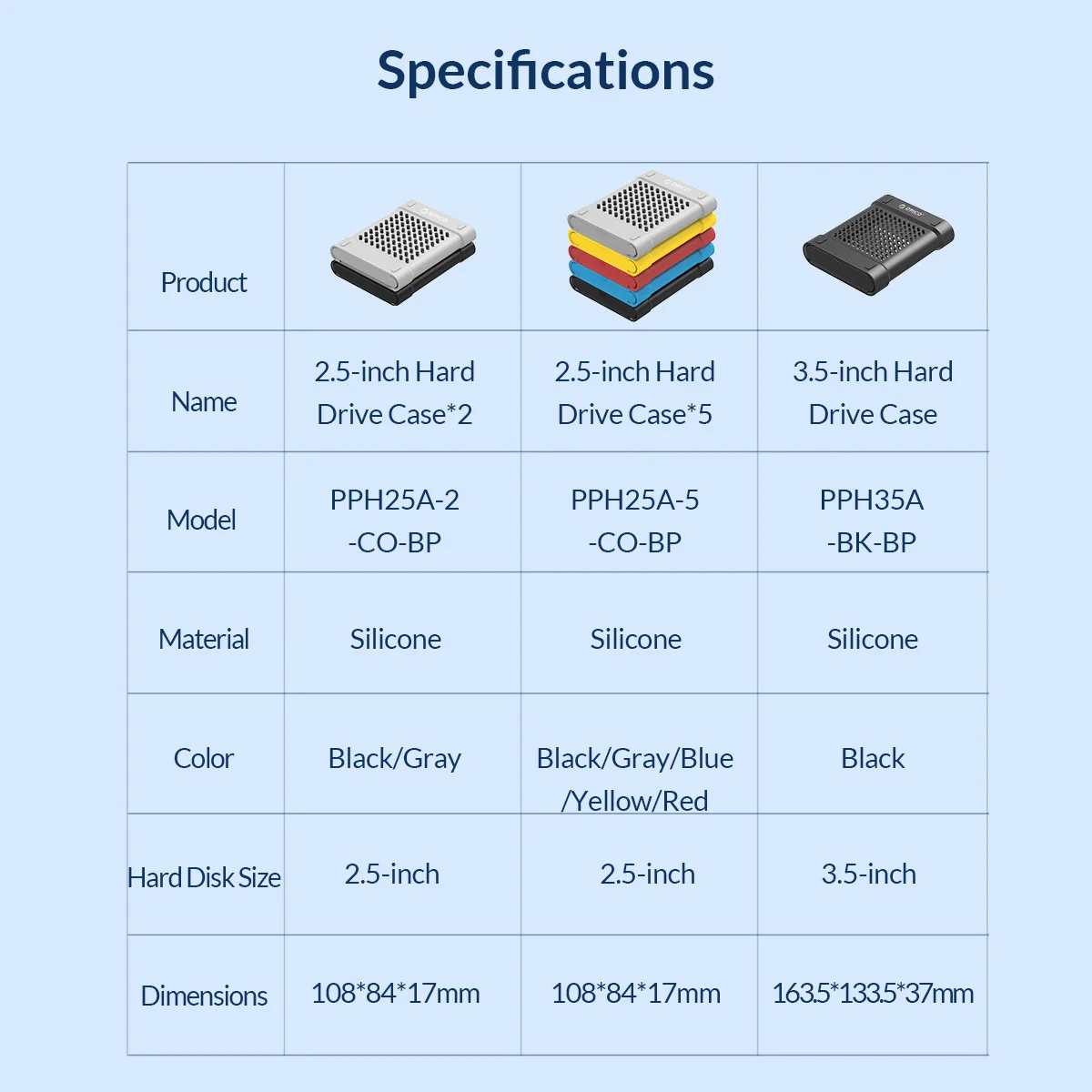 Está hecho de silicona de alta calidad y materiales respetuosos con el medio ambiente, que pueden proporcionar Almacenamiento y protección integral para discos duros y prolongar la vida útil de los discos duros