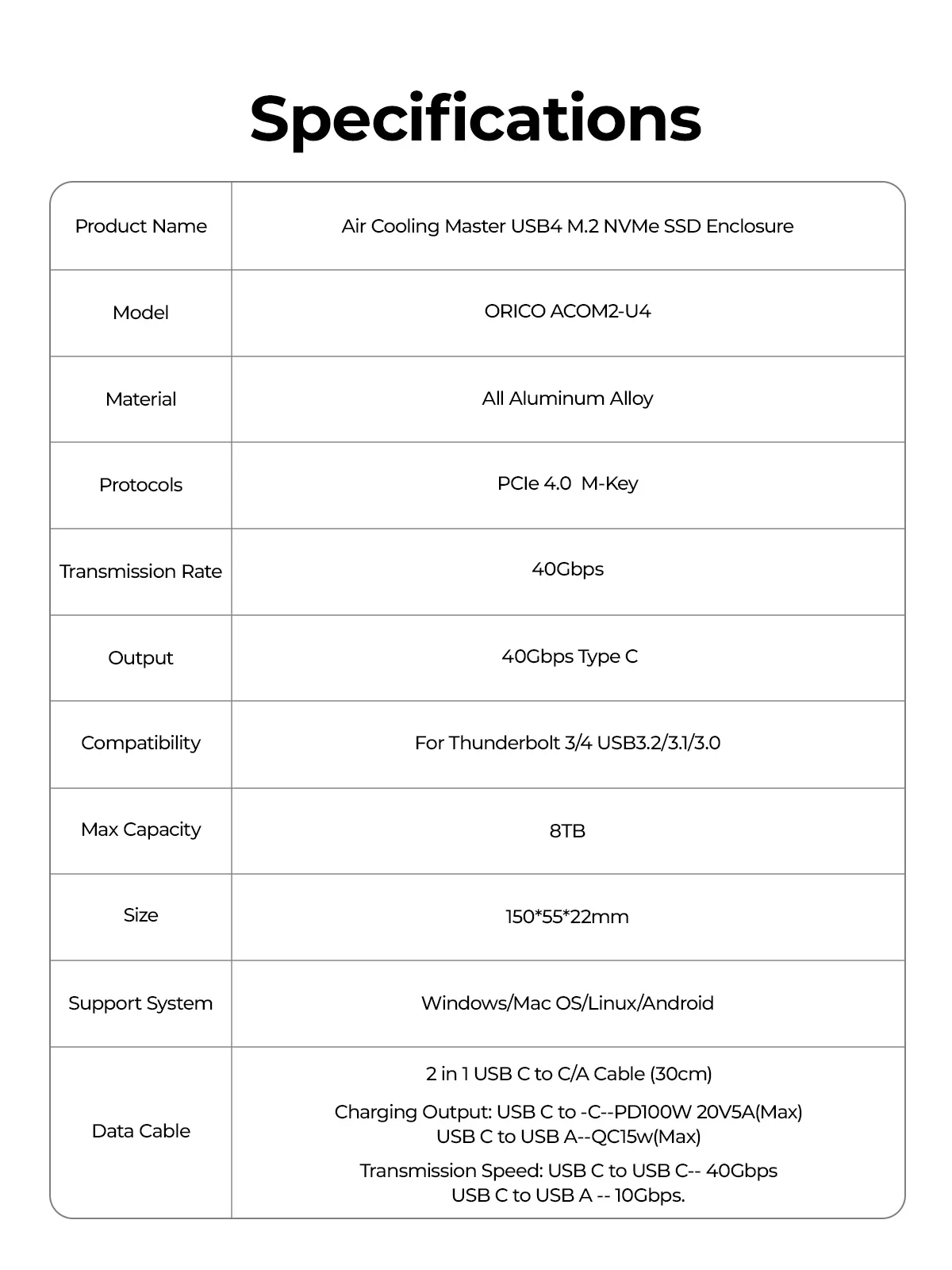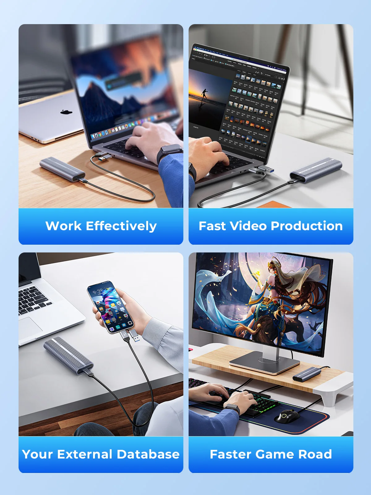 Con tecnología USB4,esta carcasa SSD proporciona velocidades de transferencia de datos ultrarrápidas de hasta40 Gbps.haciendo que las transferencias y copias de seguridad de archivos sean rápidas y eficientes.