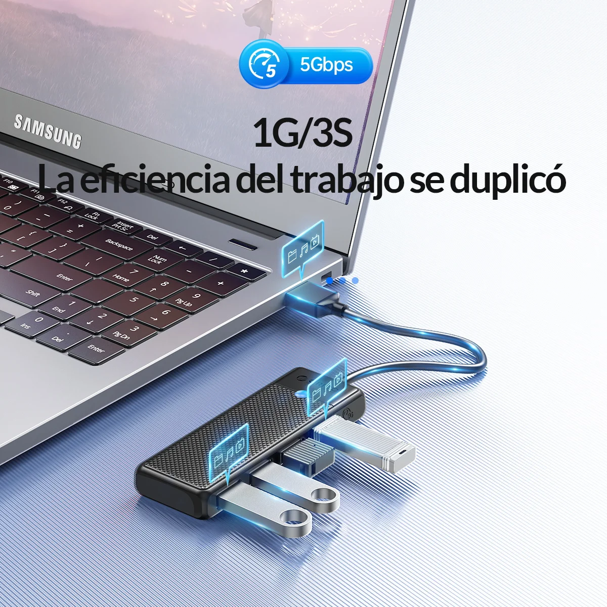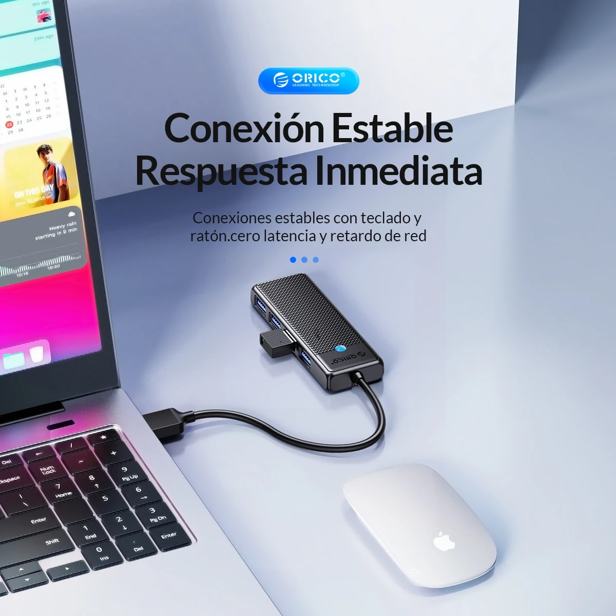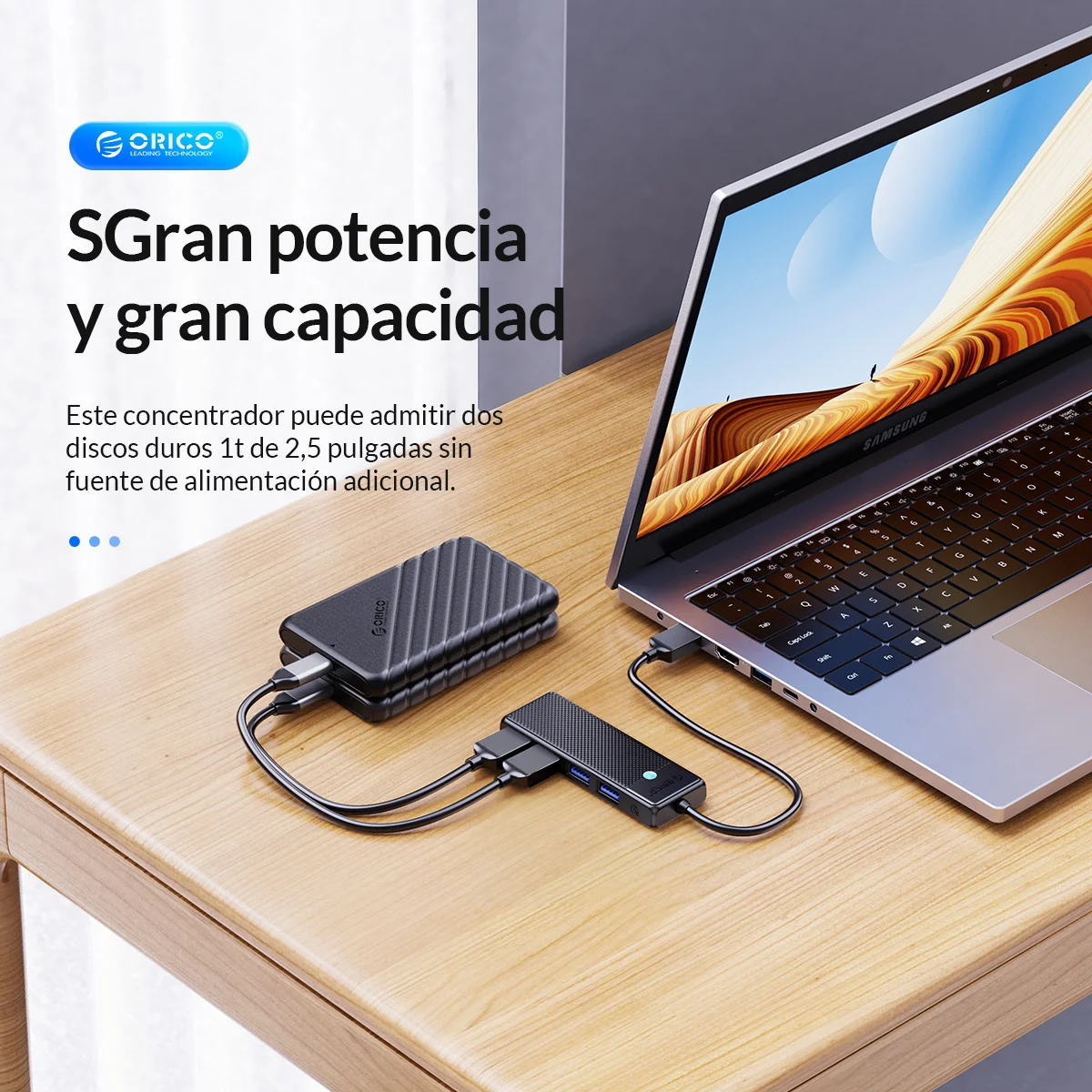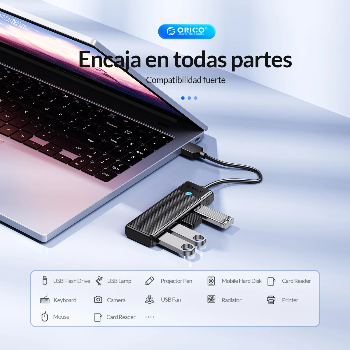 ORICO hub USB de 4 puertos se aplica a varios dispositivos: portátil, torre de pc, XBOX, PS4, unidad flash, teclado, ratón, lector de tarjetas, HDD, adaptador OTG para teléfono móvil, impresora, cámara, ventilador USB y cables USB.