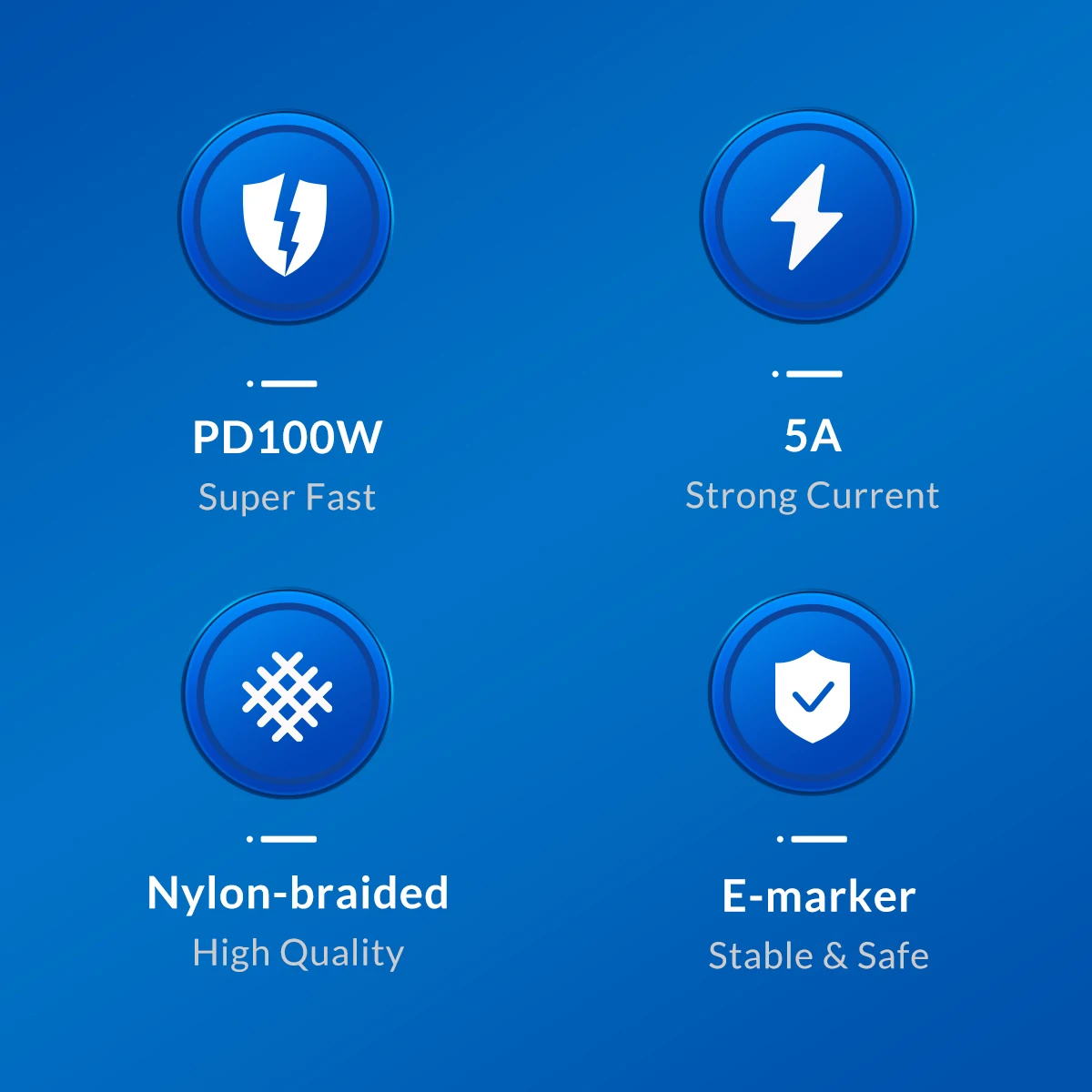 El chip E-Marker incorporado del cable de carga PD tipo C, el chip E-Marker para ayudar a estabilizar la corriente y el voltaje, protege su dispositivo para una carga segura y una carga rápida.