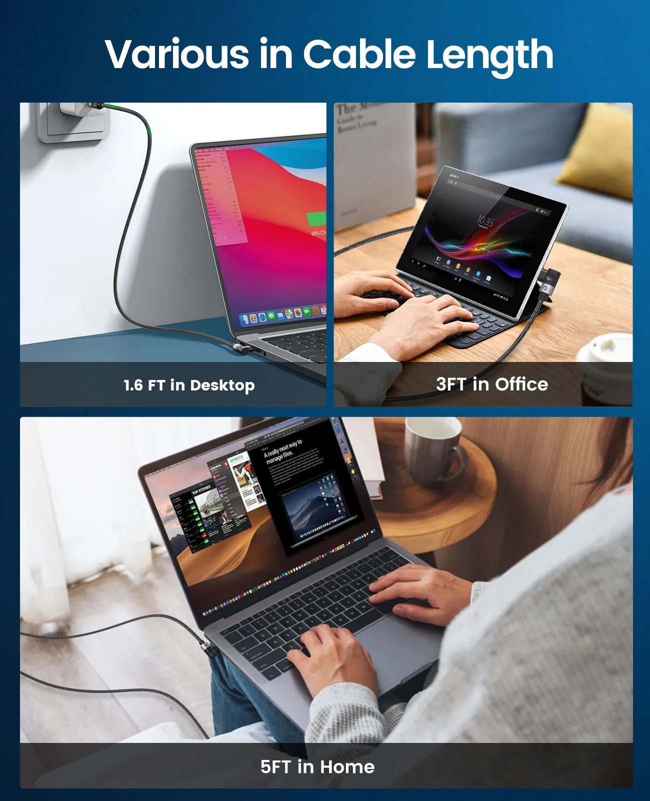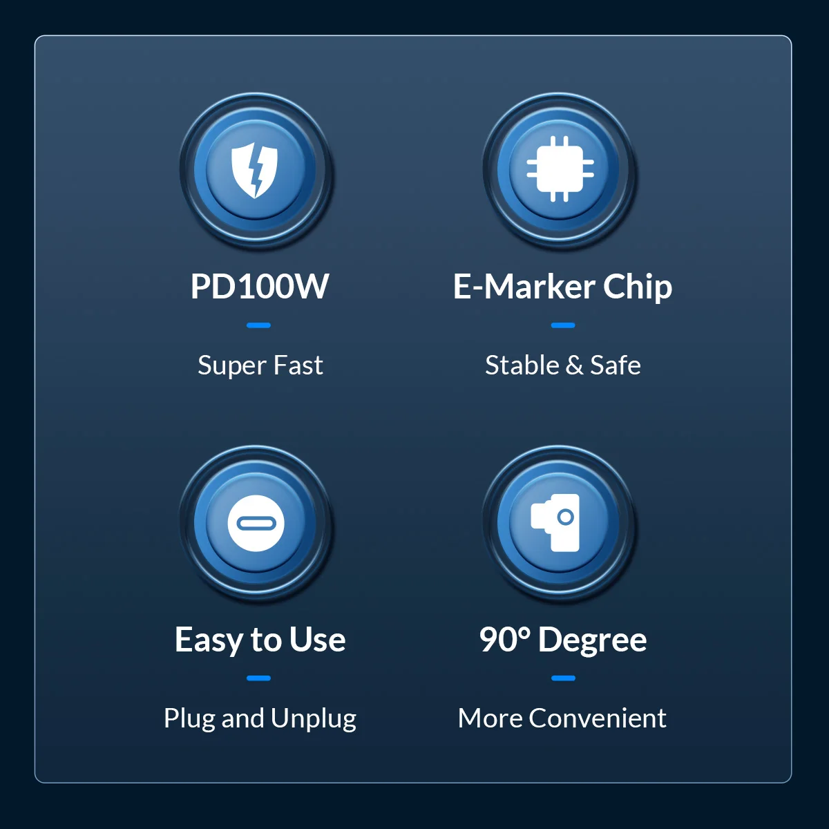 Carga rápida de hasta 100W (5A), compatible con protocolo de carga PD3.0/QC4.0/3,0. Y transmisión de datos USB 2,0. Puede cargar completamente su MacBook Pro en 2,4 horas cuando se combina con el cargador original. NOTA: Las velocidades de carga variarán dependiendo de su dispositivo y adaptador de corriente de pared.